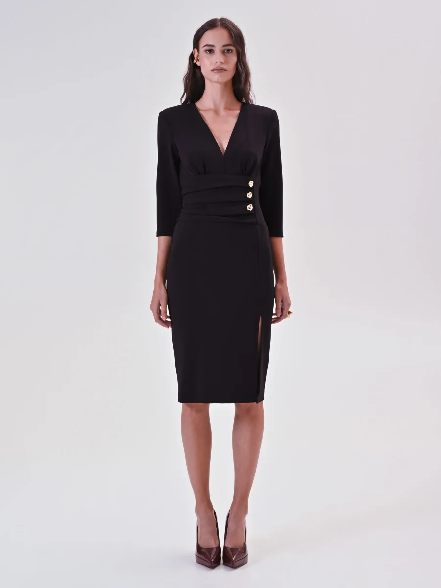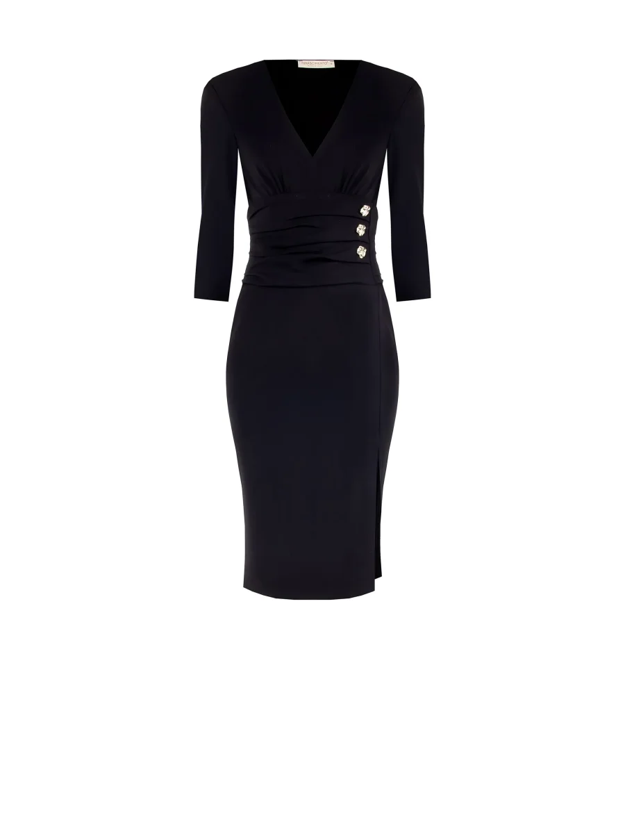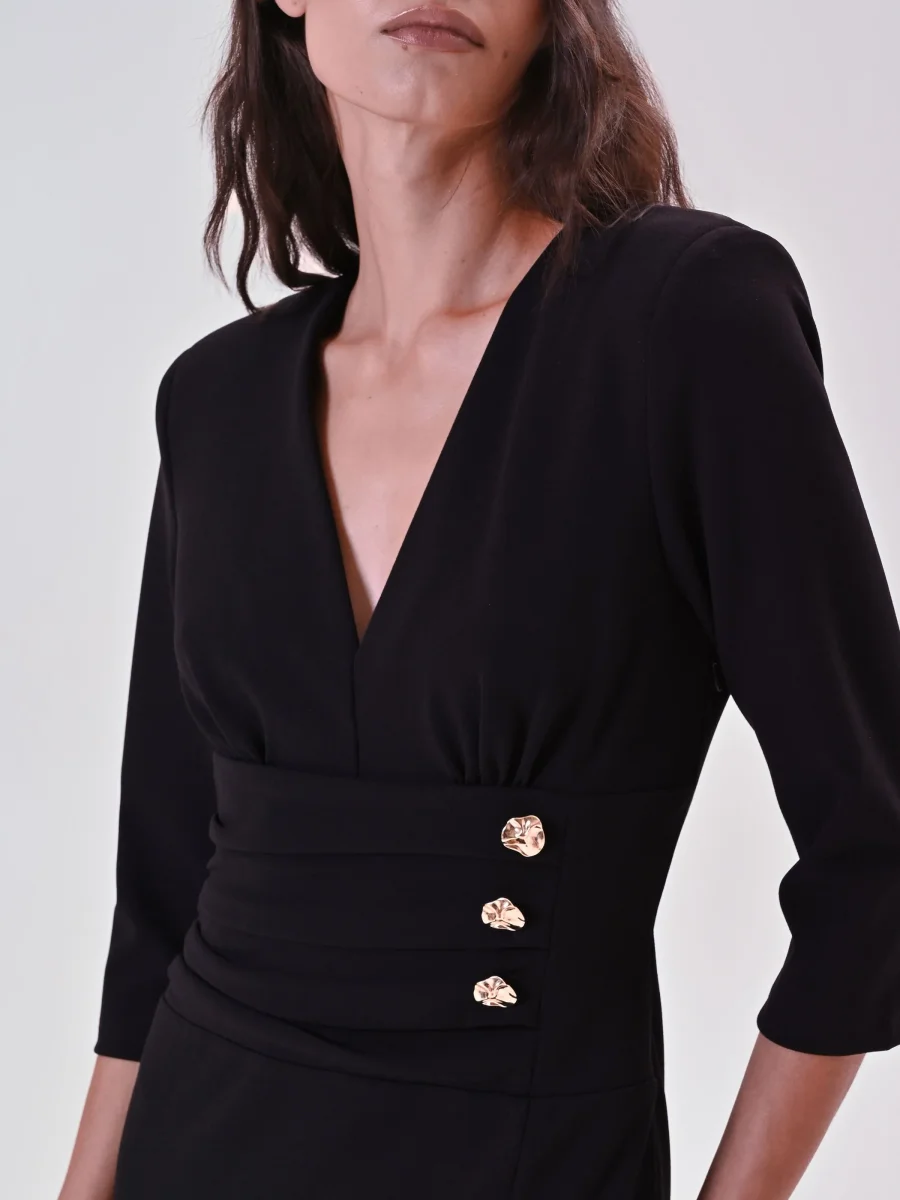 Tubino Nero con Banda Drappeggiata e Bottoni Design