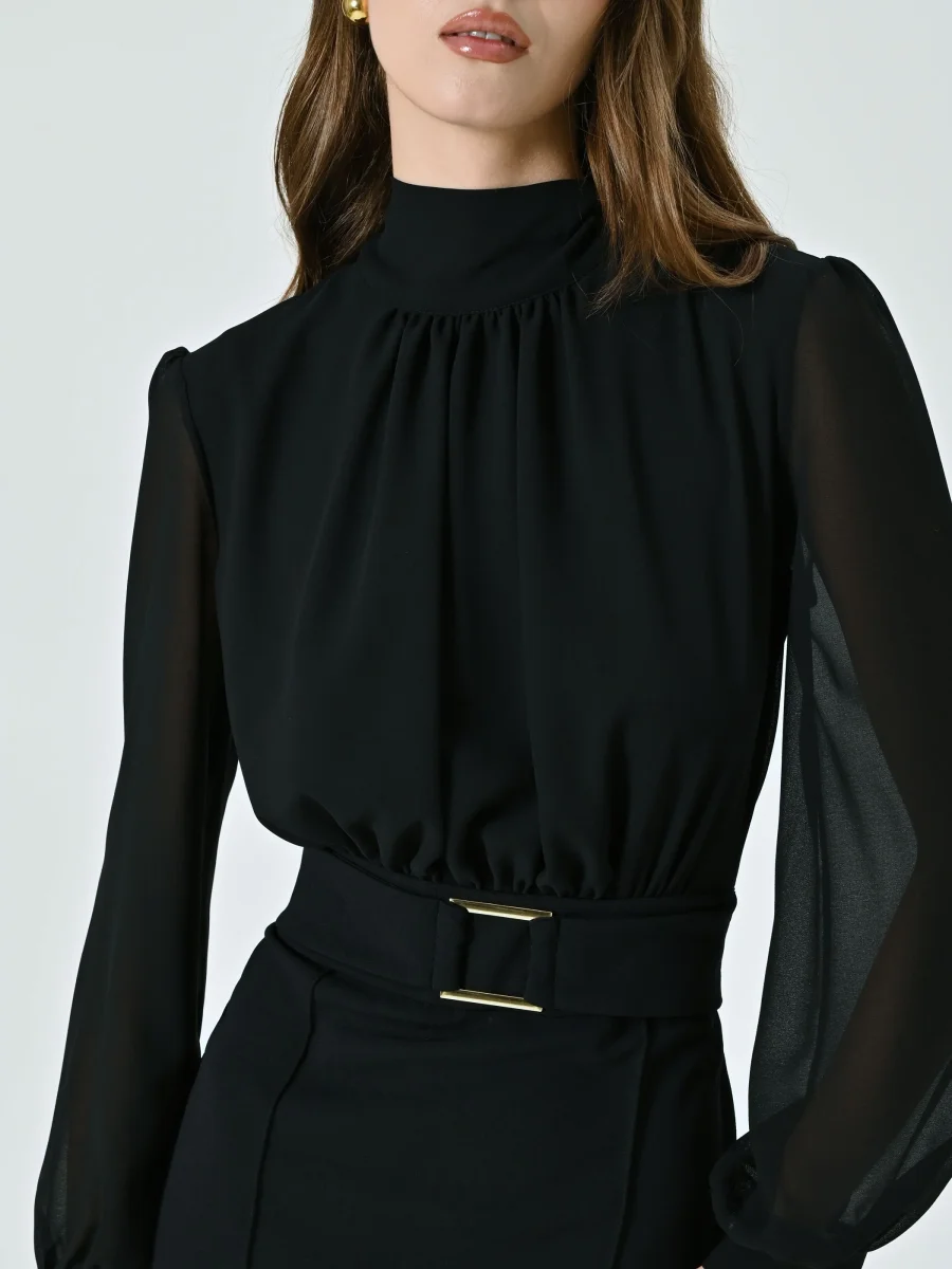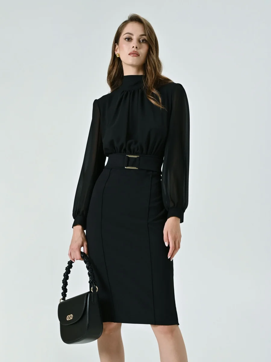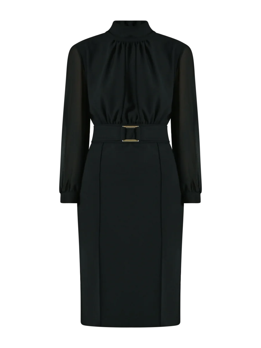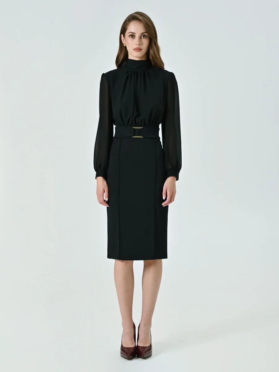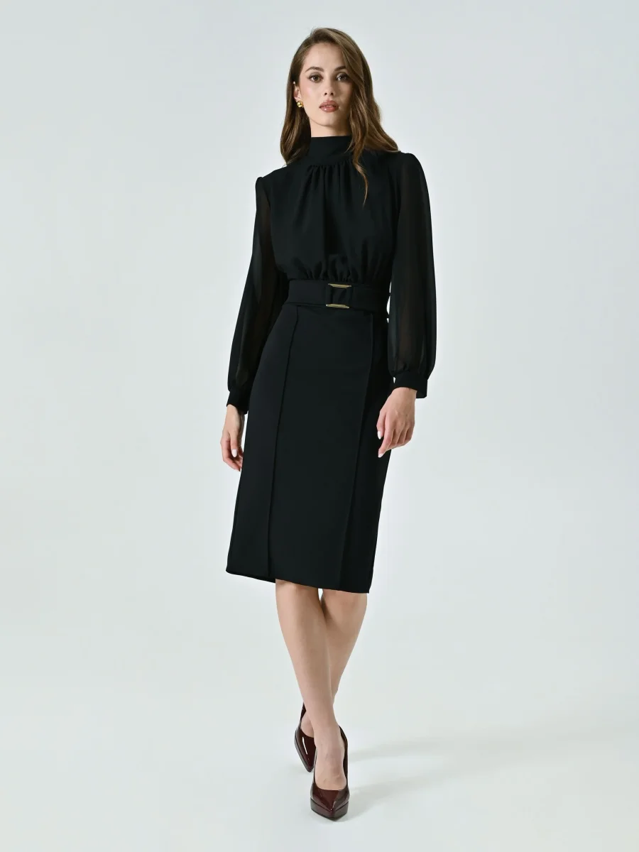Il Tubino con Fibbia Geometrica è un modello raffinato che unisce linee pulite e dettagli distintivi, ideale per valorizzare la silhouette con eleganza. Composto da una blusa in georgette e una gonna in scuba mano crepe, il Tubino con Fibbia Geometrica è caratterizzato da maniche lunghe, collo in piedi, corpino drappeggiato e polsini camicia. L’inserto in vita con fibbia geometrica, fissa e non removibile, aggiunge un accento moderno, mentre la chiusura con zip posteriore e bottoncino assicura una vestibilità comoda e precisa. Il Tubino con Fibbia Geometrica si completa alla perfezione con calzature e accessori di collezione. Indossalo per la laurea, in ufficio o per una cerimonia, interpretandolo a seconda delle esigenze. Per un fit impeccabile scegli la collezione Lingerie Rinascimento.