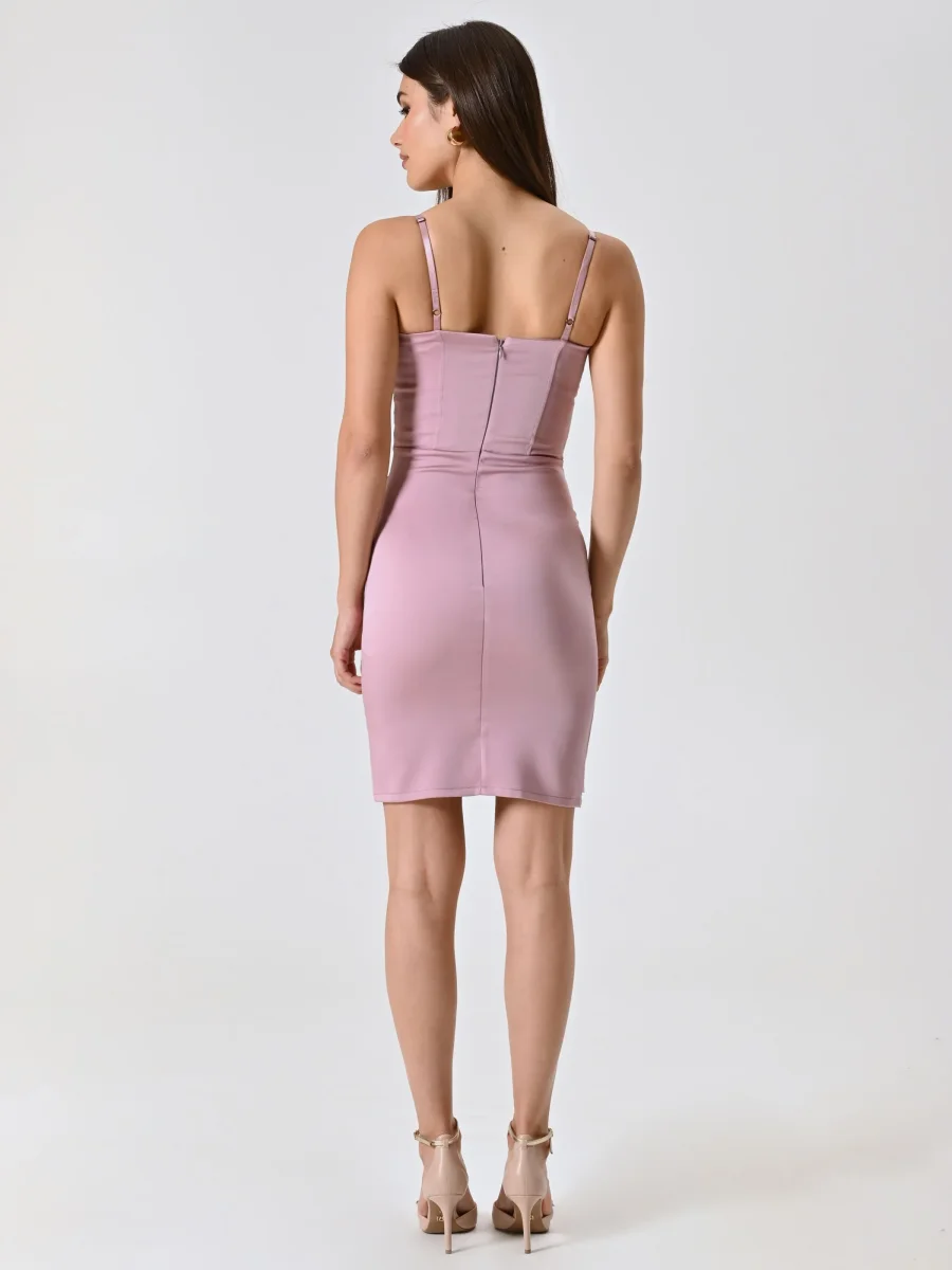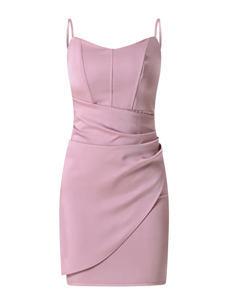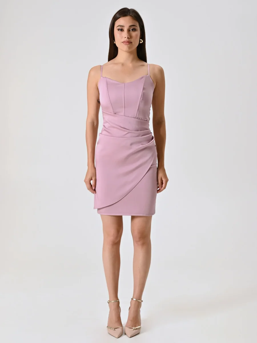 Realizzato in raso, il Tubino in Raso presenta spalline sottili regolabili, impunture a vista e un raffinato drappeggio di pieghe cucite che valorizza il punto vita. Lo scollo a V aggiunge un tocco sensuale al design, completato dalla chiusura con zip posteriore per una vestibilità fluida e impeccabile.