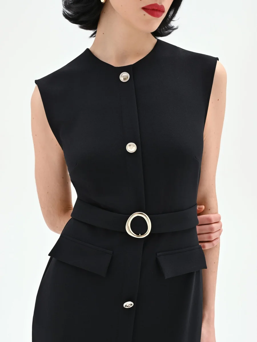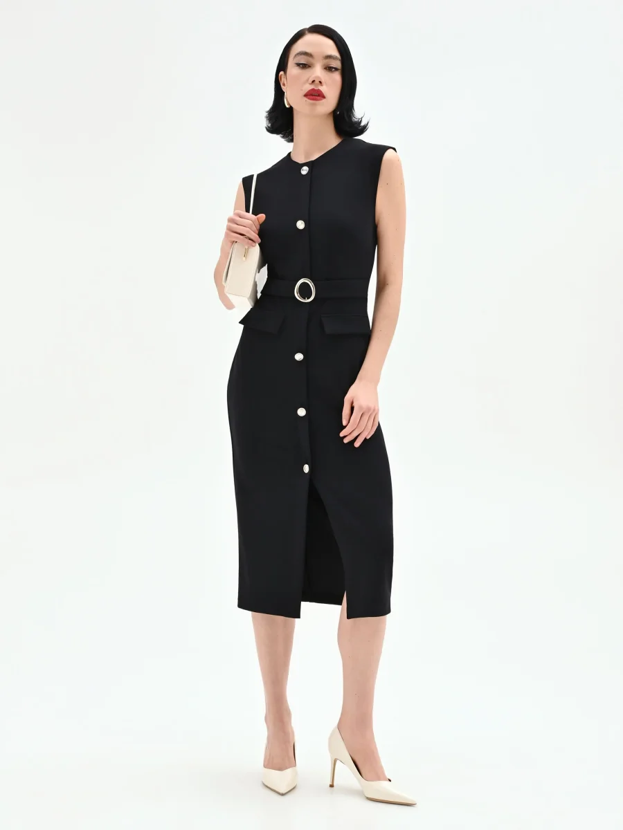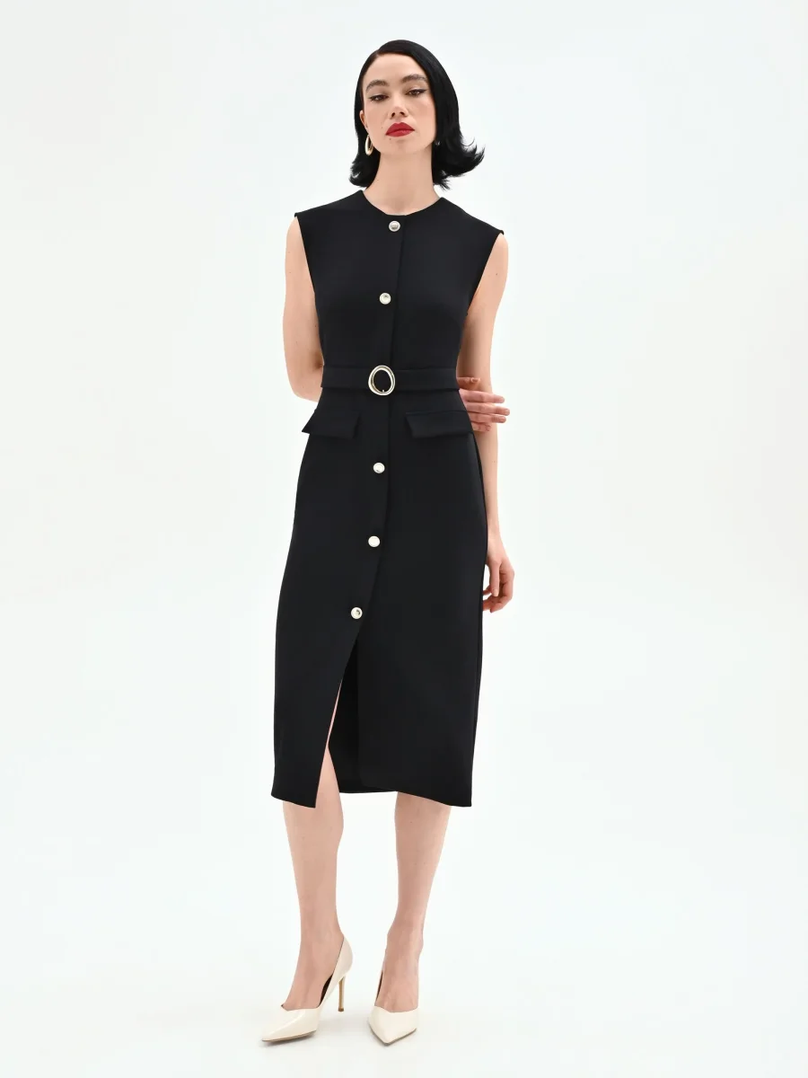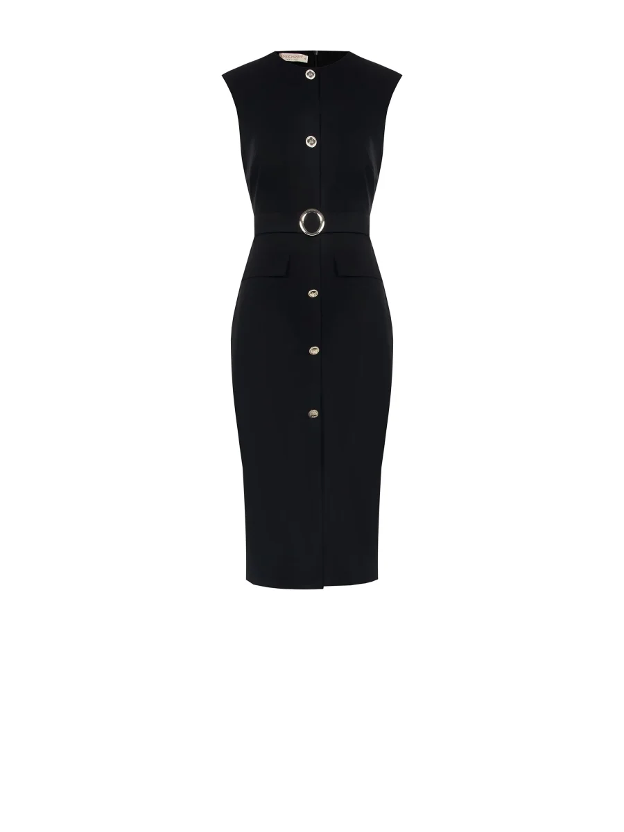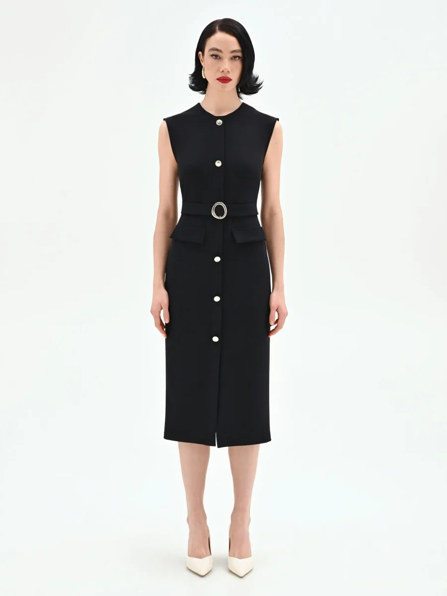 Il design di lunghezza midi è caratterizzato da uno scollo rotondo e da una fila centrale di bottoni con finitura metallica argentata che, insieme alla fibbia ovale della cintura tono su tono, creano punti luce sofisticati sul fondo scuro. Le tasche a filetto con patta aggiungono un dettaglio geometrico e funzionale all’estetica d’insieme, mentre la chiusura con zip assicura una vestibilità precisa e aderente.