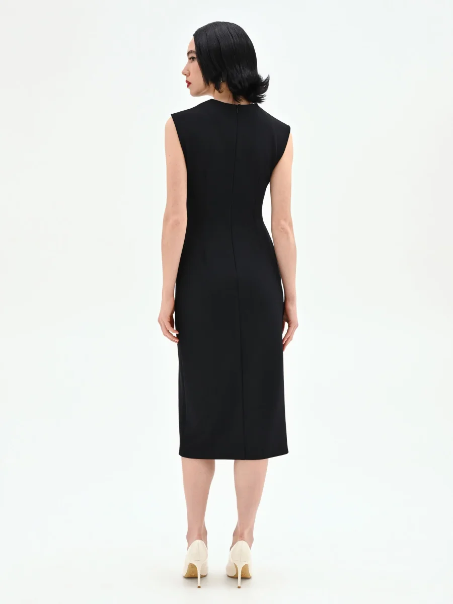 Un equilibrio studiato tra rigore contemporaneo e seduzione discreta definisce questo tubino smanicato nero, pensato per accompagnare la silhouette con carattere e decisione. Realizzato in tessuto scuba mano crepe, il capo offre una consistenza strutturata che modella le forme mantenendo un comfort assoluto, ideale per affrontare lunghe giornate tra impegni lavorativi e appuntamenti serali.
