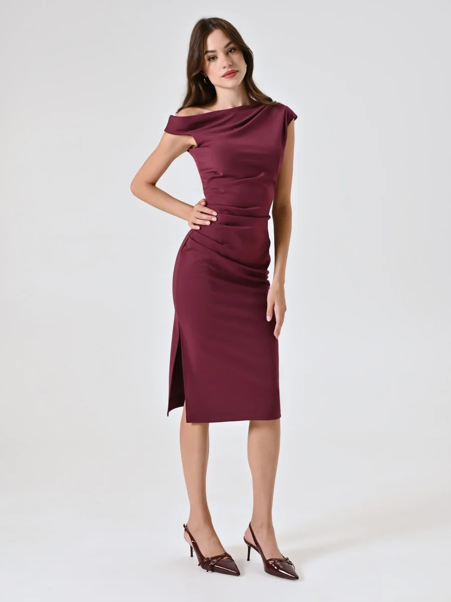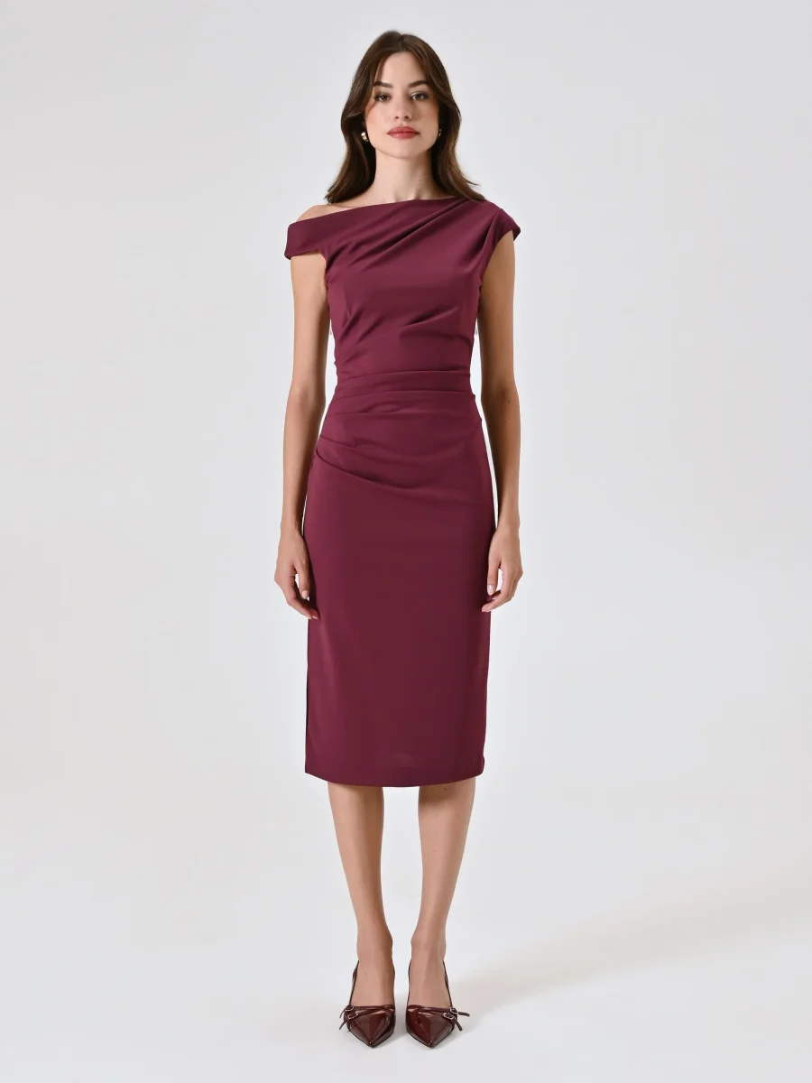 Realizzato in jersery punto Milano, questo tubino è definito da un raffinato gioco di asimmetrie: la spallina strutturata si alterna a una seconda spallina drappeggiata, che crea un elegante effetto fluido. Il design è completato da un delicato drappeggio e da una chiusura con zip posteriore, per una vestibilità confortevole e avvolgente.