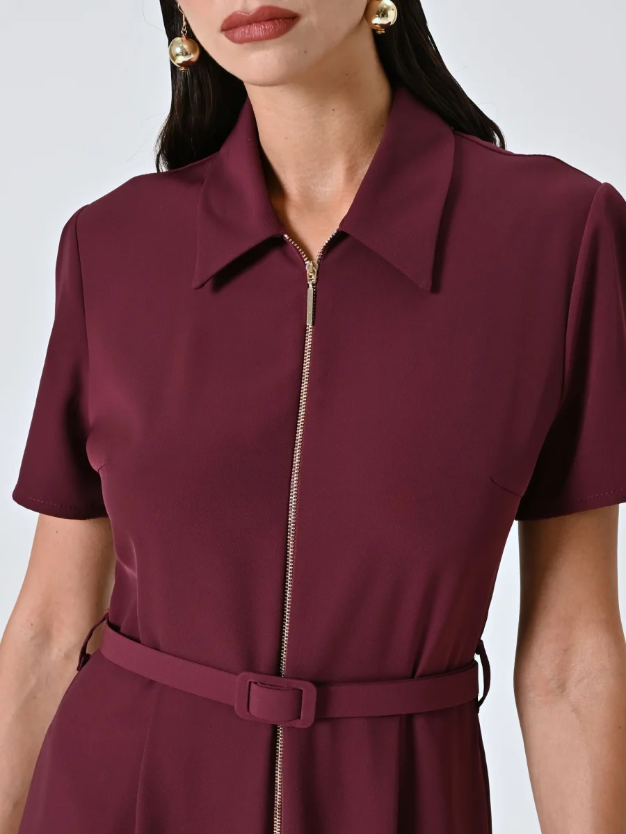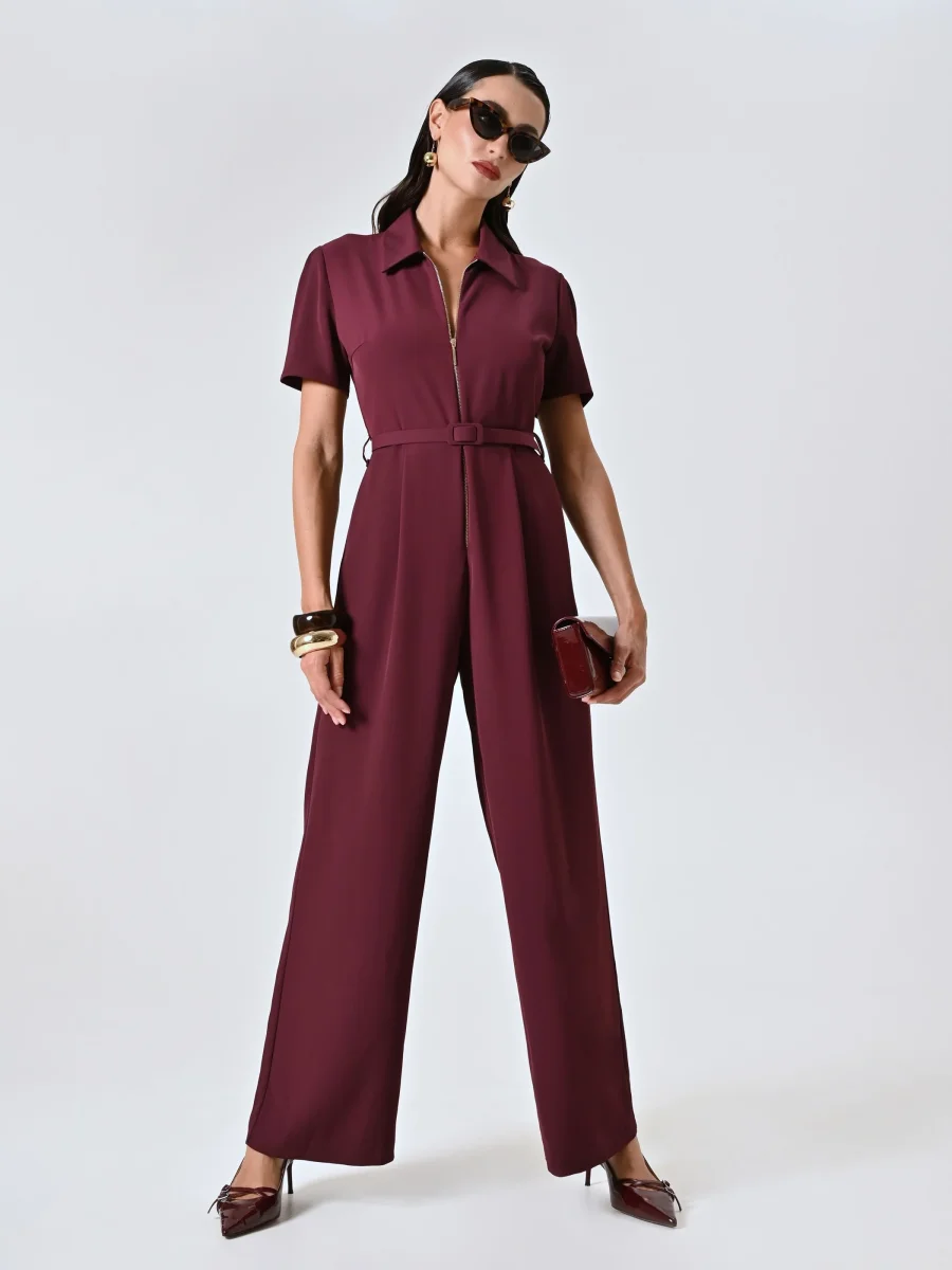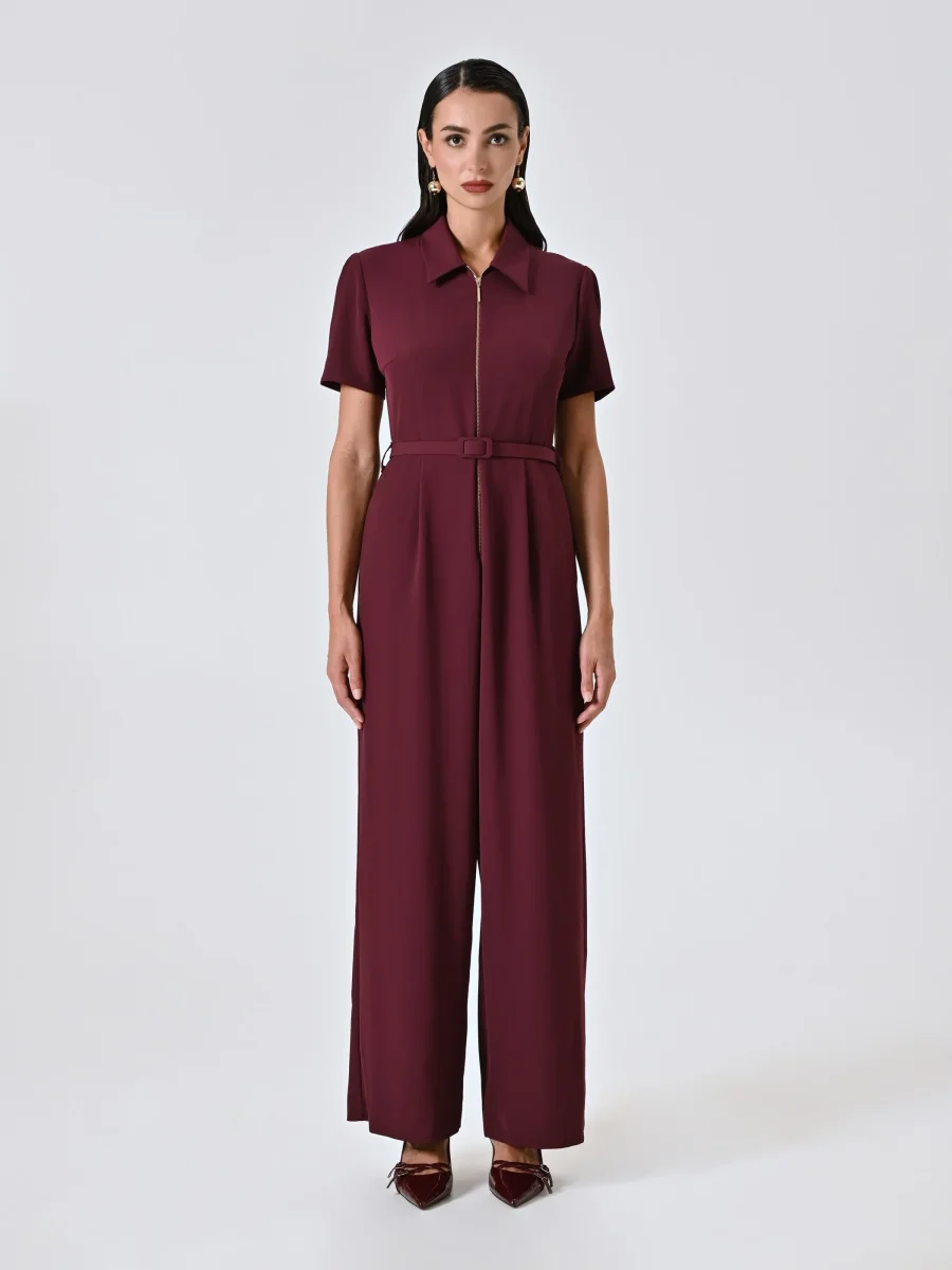 Realizzata in tessuto fluido, la Tuta Bordeaux con Zip presenta un colletto classico, una zip dorata a vista che impreziosisce il davanti, maniche corte e una cintura ricoperta removibile con passanti coordinati. I pantaloni ampi e le tasche alla francese aggiungono praticità e movimento alla silhouette. La chiusura con zip rende il capo facile da indossare e valorizza la linea.