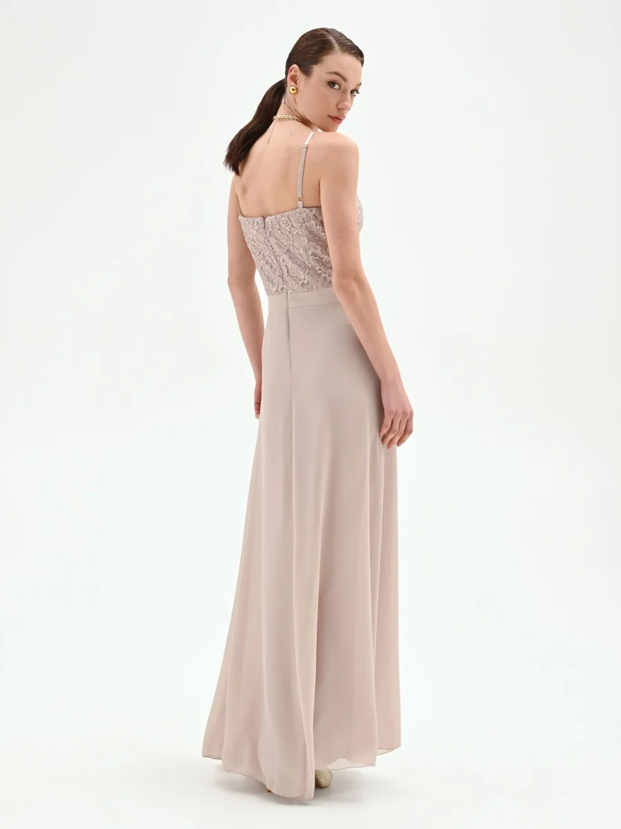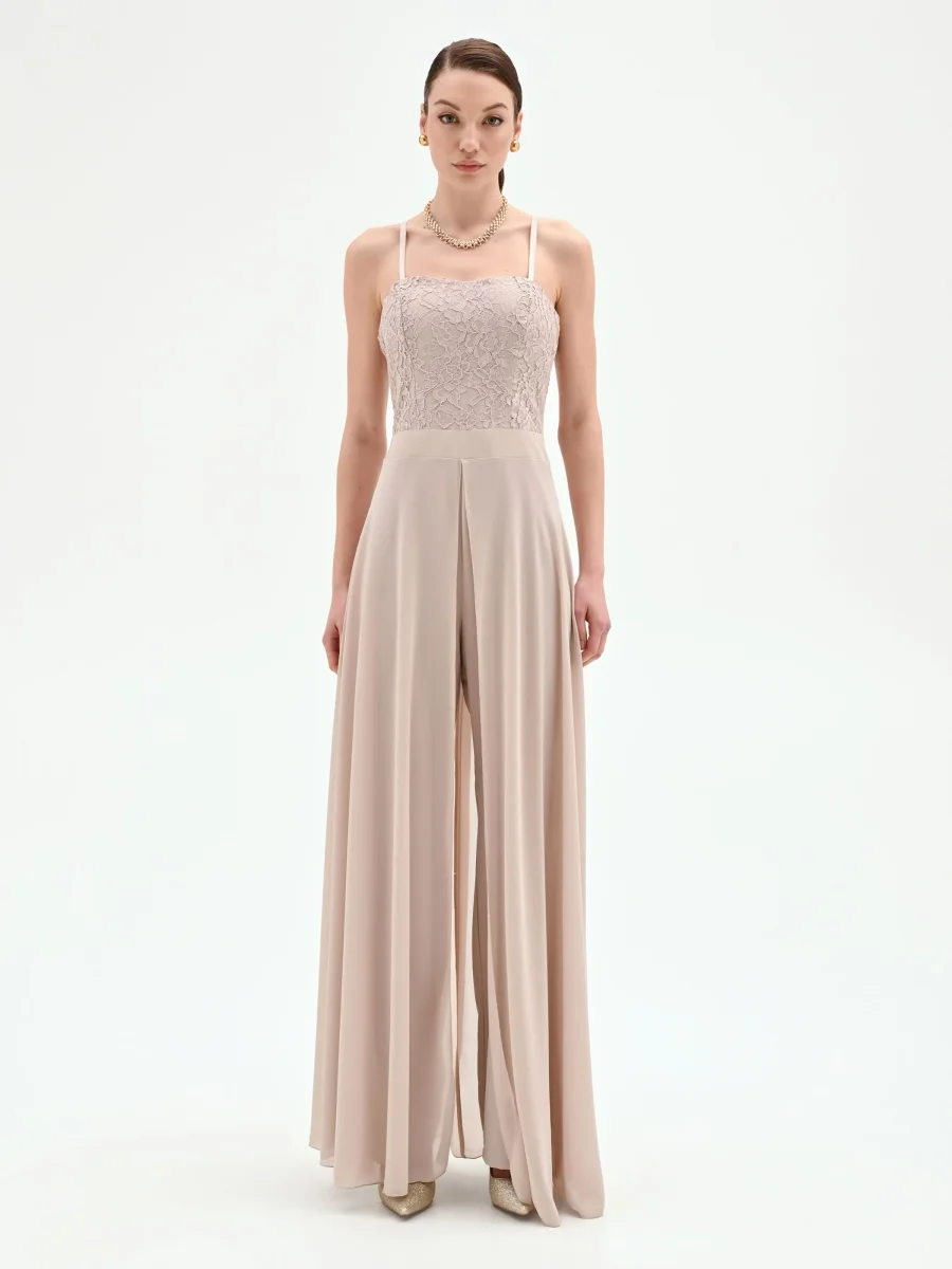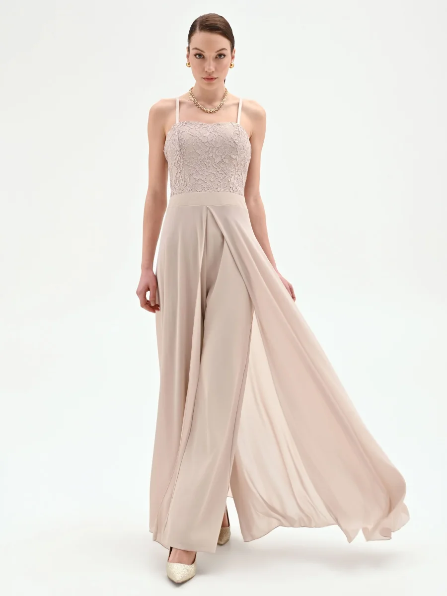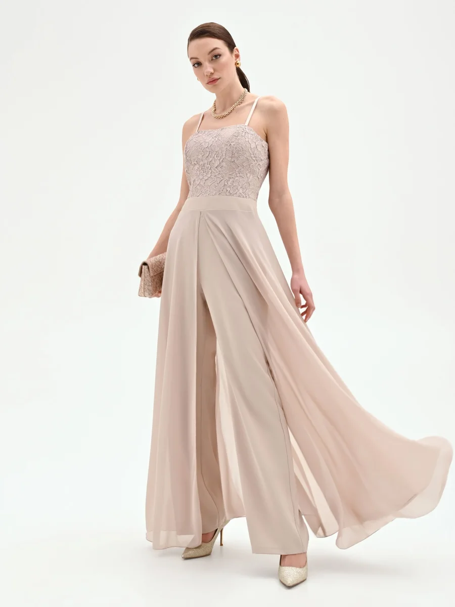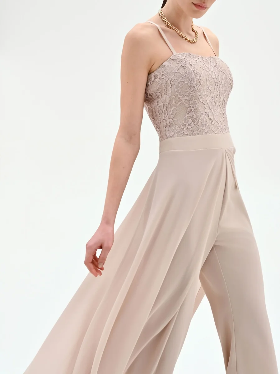 Un’alternativa ricercata al classico abito, la tuta tortora beige esprime un’eleganza contemporanea, perfetta per le cerimonie e gli eventi più importanti. Il suo design unico fonde la delicatezza di un corpetto in pizzo floreale con la fluidità dei pantaloni a palazzo. La scollatura dritta, sorretta da spalline sottili, incornicia il décolleté con grazia, mentre una fascia liscia definisce il punto vita. La parte inferiore sorprende con ampi pantaloni in tessuto leggero, velati da un pannello sovrapposto aperto sul davanti, che crea un suggestivo effetto abito e accompagna ogni passo con un movimento etereo. La chiusura posteriore con zip invisibile assicura una linea pulita e una vestibilità precisa. Indossala con sandali gioiello e una pochette per un total look da cerimonia che non passerà inosservato.