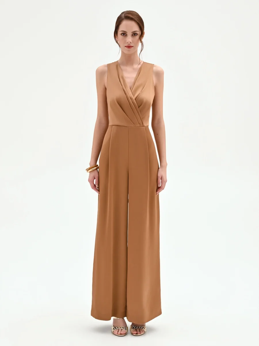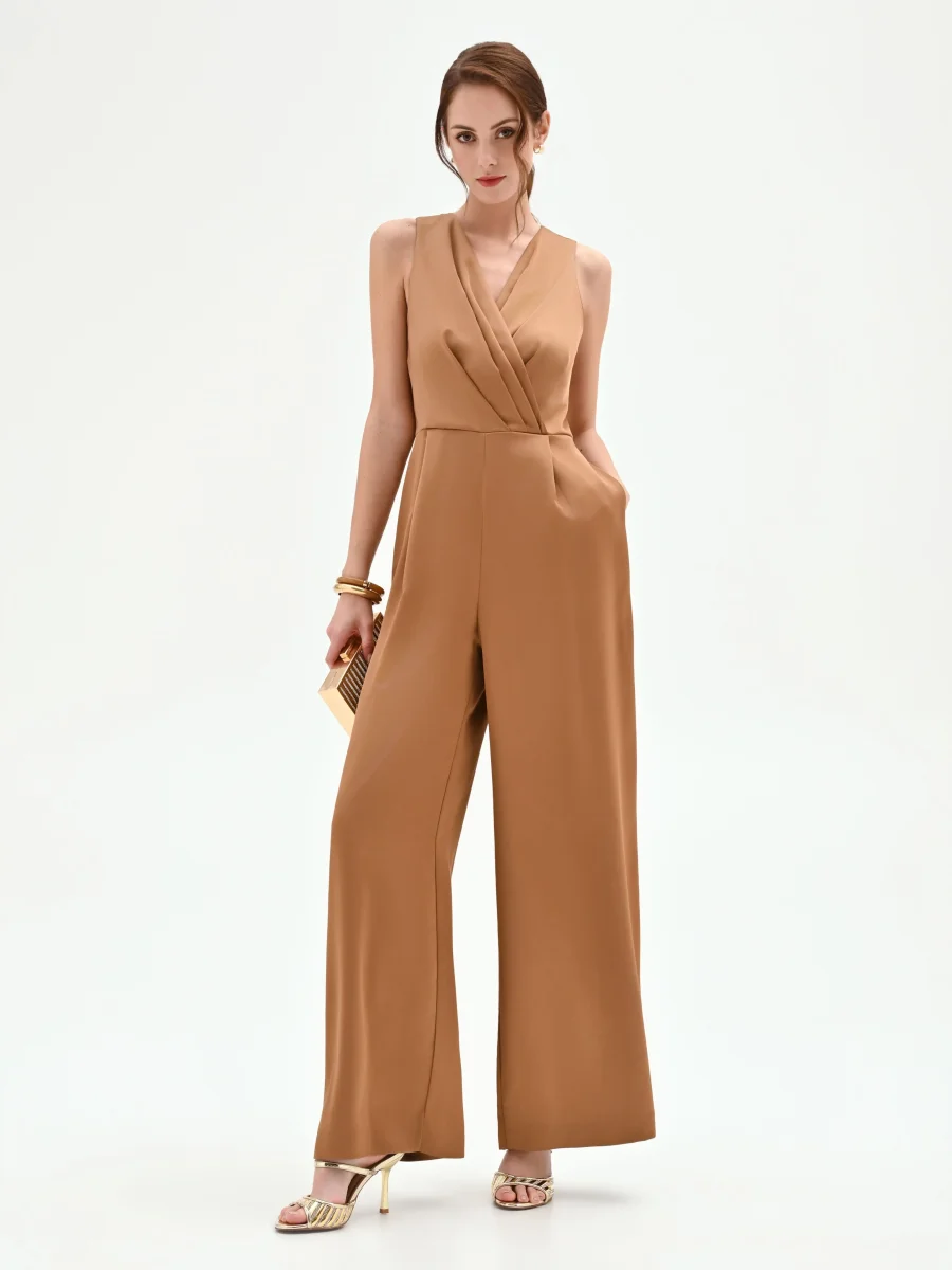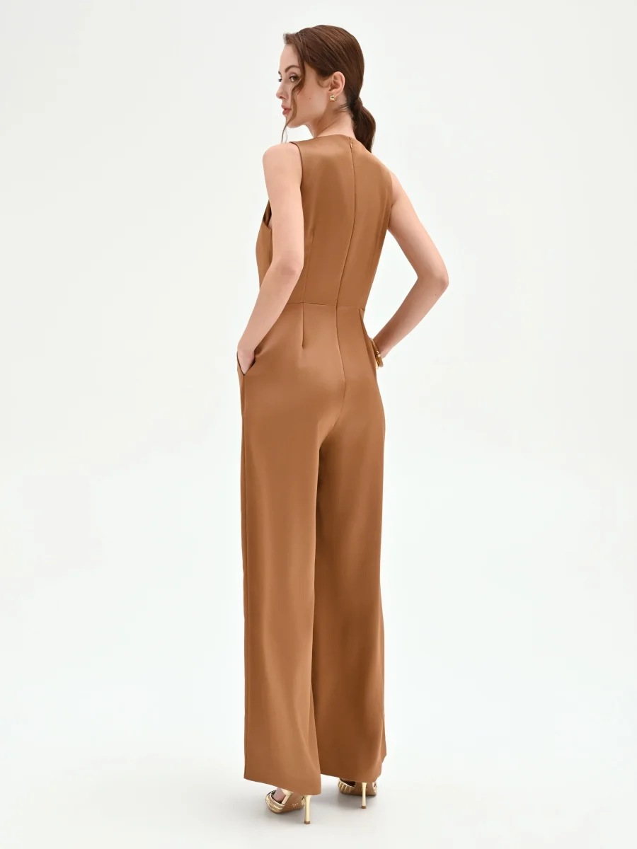 Un’eleganza fluida e contemporanea prende forma nella tuta intera marrone bronzo, un capo pensato per chi desidera distinguersi nelle occasioni speciali con un look sofisticato e di carattere. Realizzata in raso liscio, la sua texture luminosa scivola sulla silhouette, accompagnando ogni movimento con grazia. Il design si concentra sulla parte superiore smanicata, dove uno scollo a V a incrocio è valorizzato da un morbido drappeggio che disegna il décolleté. Il punto vita definito segna il passaggio al pantalone a palazzo, caratterizzato da una linea ampia e dritta che slancia la figura, offrendo un comfort assoluto. La chiusura con zip posteriore mantiene la linea pulita e assicura una vestibilità ottimale. Questa tuta rappresenta una valida alternativa all’abito da cerimonia o da sera, perfetta per un evento primaverile, una cena elegante o un cocktail party. Indossala con accessori bold e un sandalo con tacco per creare un outfit memorabile, capace di esprimere una femminilità moderna e decisa.