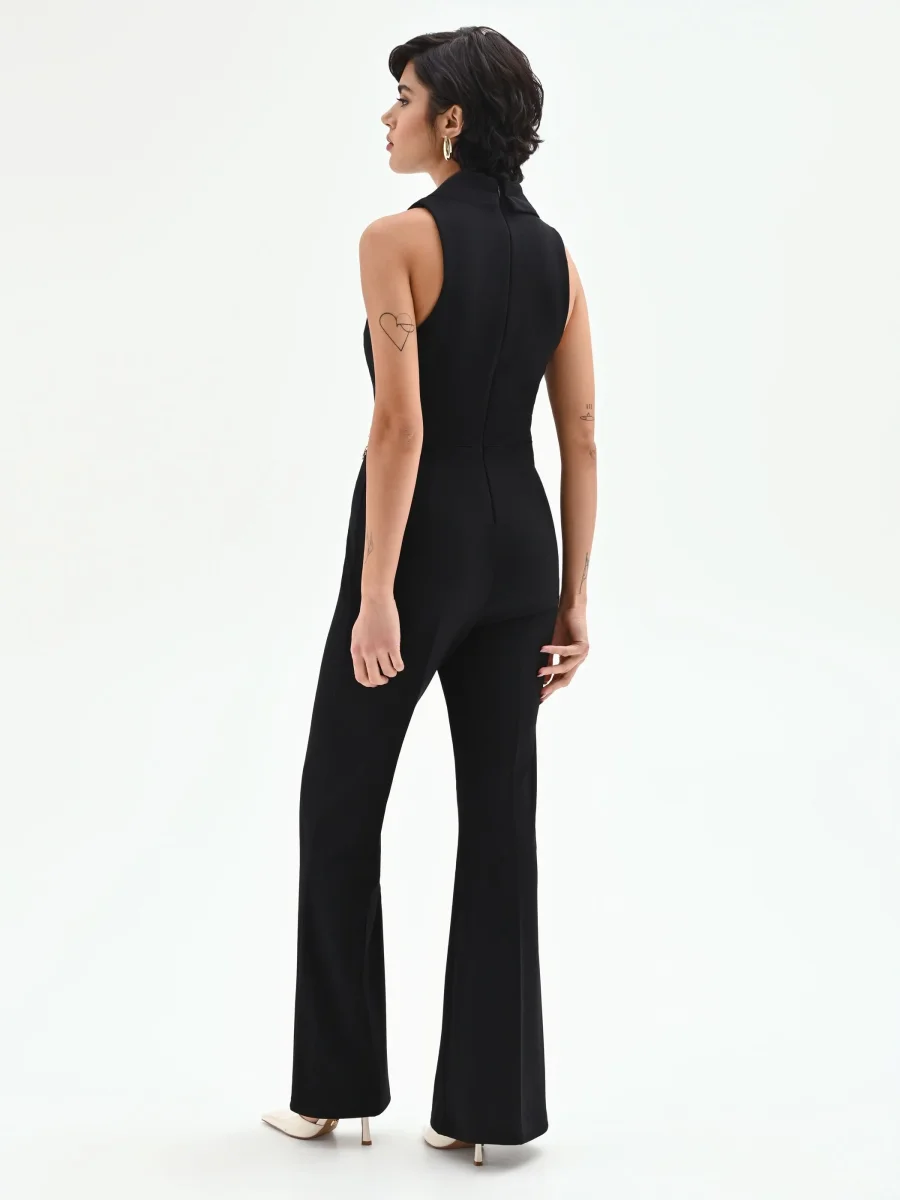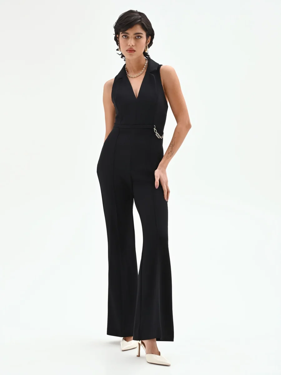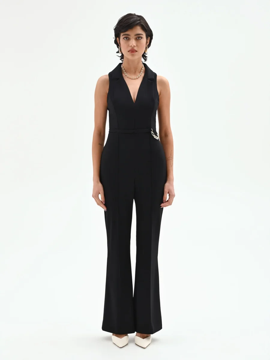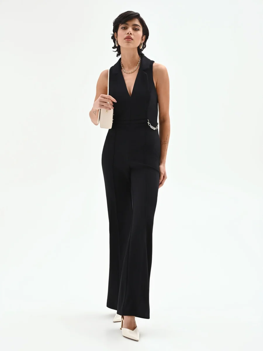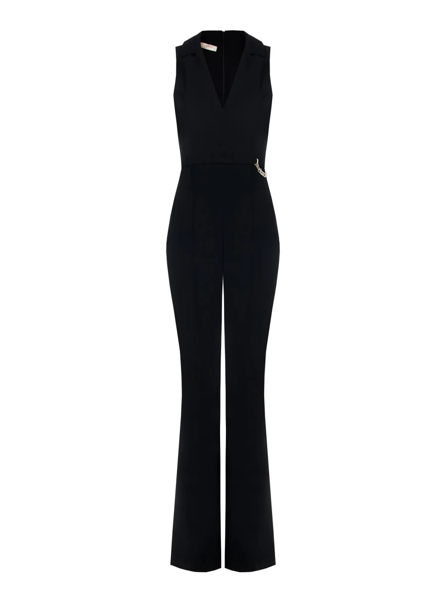 La tuta lunga nera con catena e scollo a rever si abbina perfettamente ad accessori e scarpe della collezione, come sandali minimal o décolleté a punta. Indossala per cocktail party, eventi serali o cene esclusive dove è richiesto un look d’impatto.