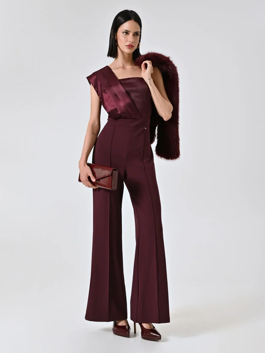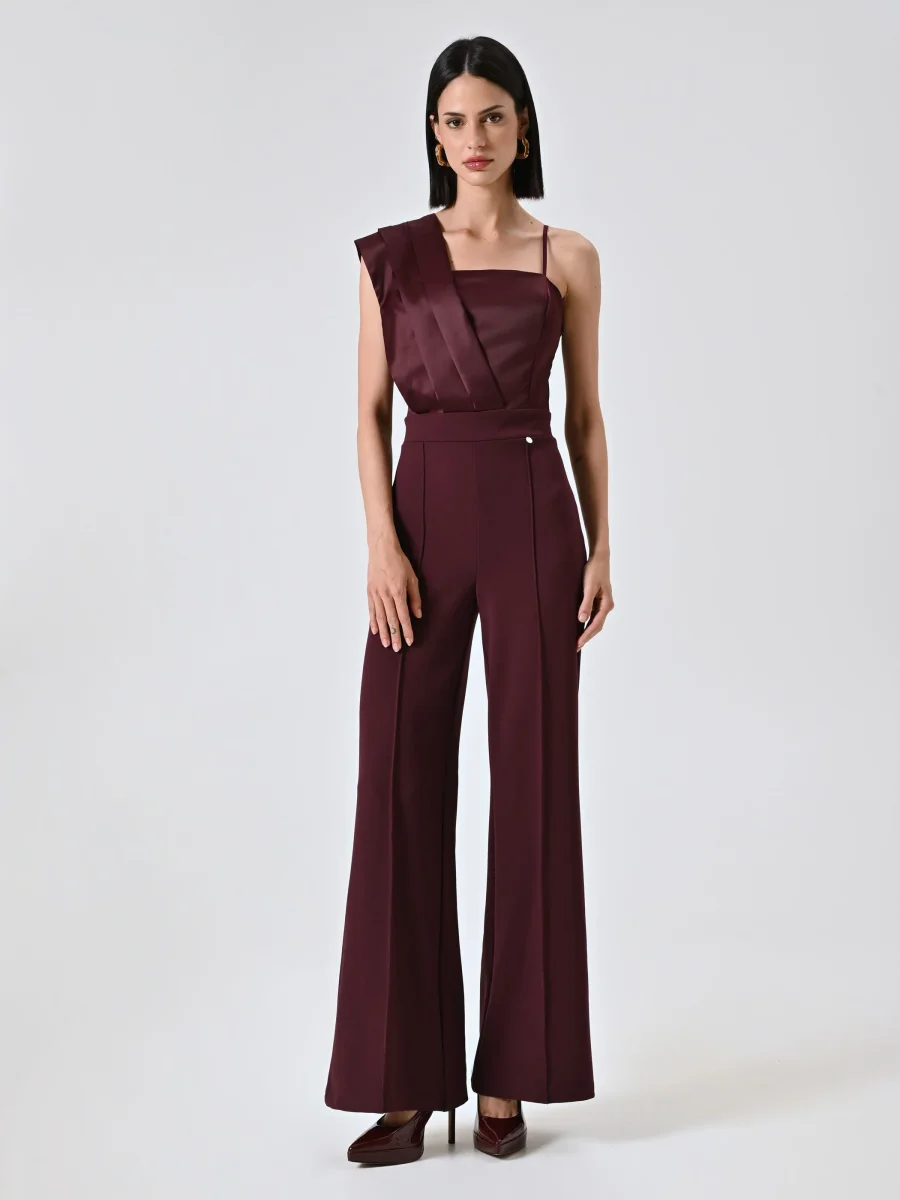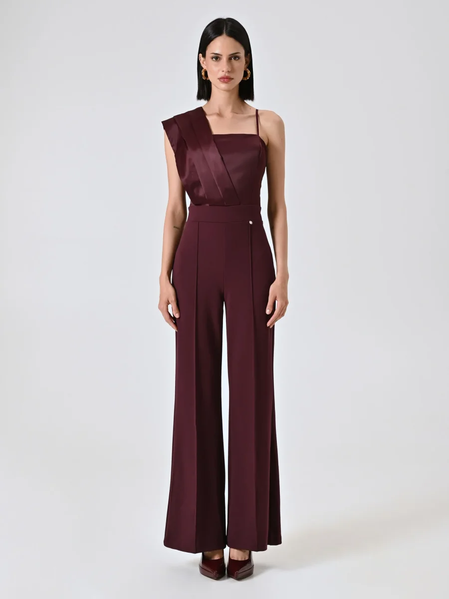 Realizzata con pantaloni in jersey e corpino in raso, la Tuta Monospalla Bordeaux si caratterizza per la costruzione asimmetrica con una spallina drappeggiata e una seconda spallina sottile regolabile. Il corpino è dotato di coppe preformate per un sostegno discreto, mentre i pantaloni sono rifiniti con piega cucita per un effetto impeccabile. La chiusura con zip posteriore completa il design con funzionalità.