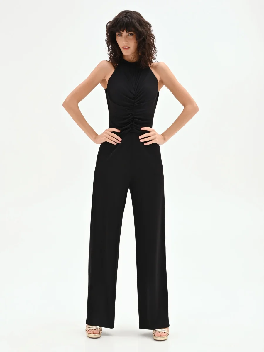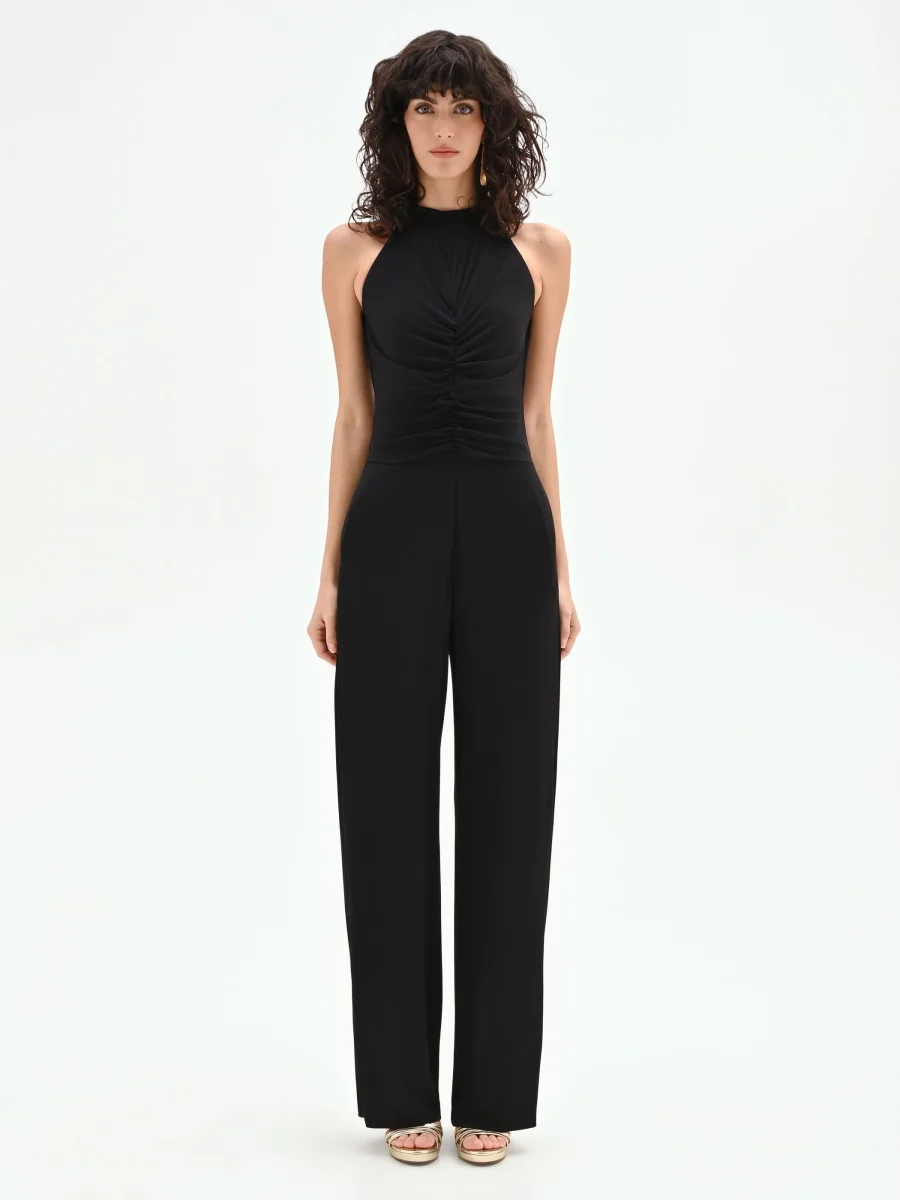 Un’eleganza fluida e contemporanea definisce la tuta nera, un capo che unisce comfort e raffinatezza in un design unico.