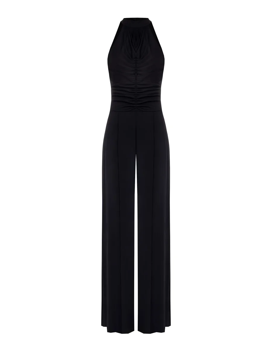 Realizzata in jersey, questa tuta intera avvolge la figura con delicatezza. La parte superiore è caratterizzata da uno scollo all’americana che lascia le spalle scoperte, valorizzando il décolleté con un tocco di sensualità. Un’arricciatura centrale disegna un drappeggio verticale che dal collo scende fino al punto vita, creando un movimento armonioso. La silhouette si completa con un pantalone a palazzo, ampio e fluido, che slancia la figura e accompagna ogni passo con grazia. Il design è studiato per scivolare sulla figura con naturalezza, garantendo una vestibilità impeccabile.