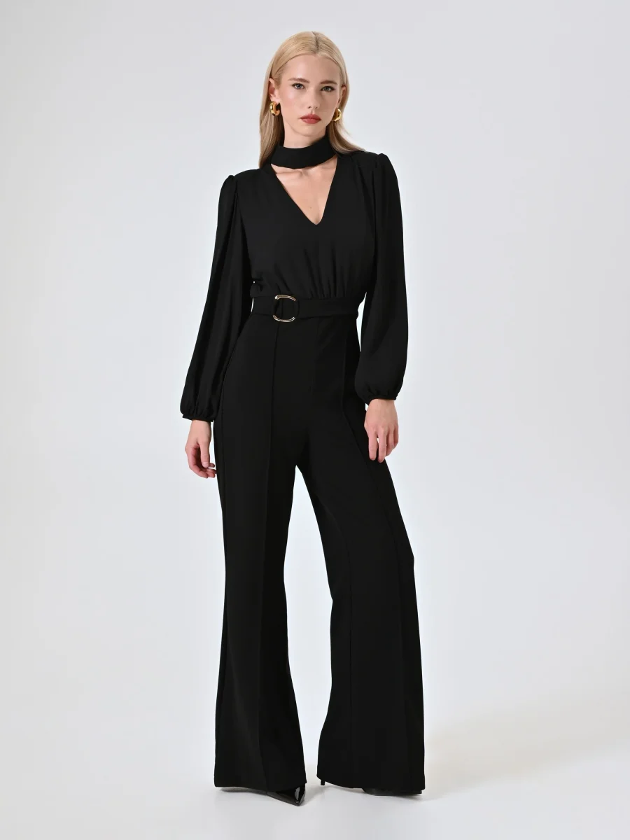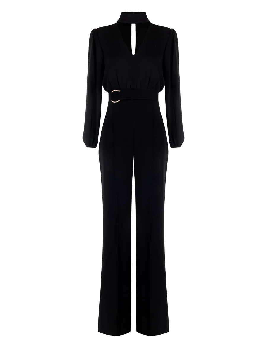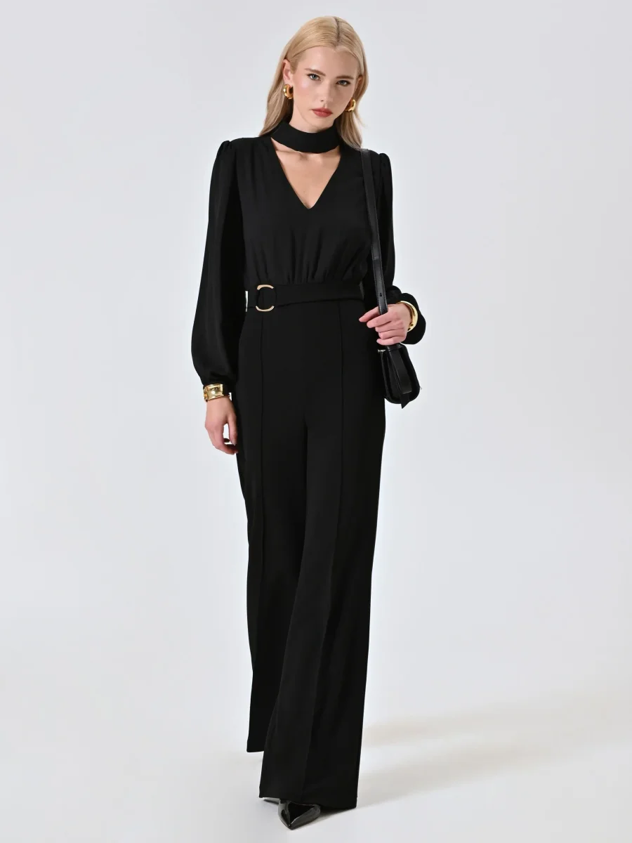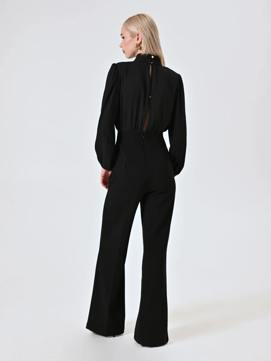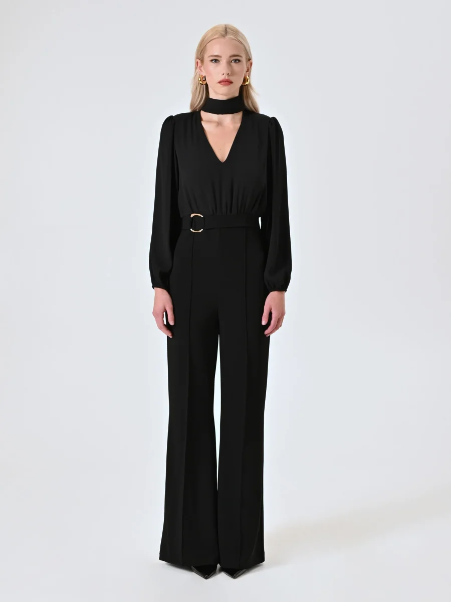 La Tuta Nera con Fibbia è un capo dall’eleganza decisa e dall’attitudine contemporanea, pensato per valorizzare la silhouette con raffinatezza nelle occasioni speciali. Realizzata con corpino in crepe georgette e pantaloni in scuba, entrambi in tessuto parzialmente riciclato, la Tuta Nera con Fibbia si distingue per il design ricercato: colletto choker, scollo a V profondo, maniche ampie a sbuffo e dettaglio fibbia in vita che sottolinea la figura. I pantaloni presentano una piega cucita per un finish impeccabile, mentre la chiusura è affidata a una zip discreta e bottoncini sul retro. La Tuta Nera con Fibbia si abbina perfettamente a calzature e accessori di collezione. Per un fit impeccabile, scegli la collezione Lingerie Rinascimento. Indossa la Tuta Nera con Fibbia per eventi serali o momenti da ricordare, quando desideri sentirti femminile e sofisticata.