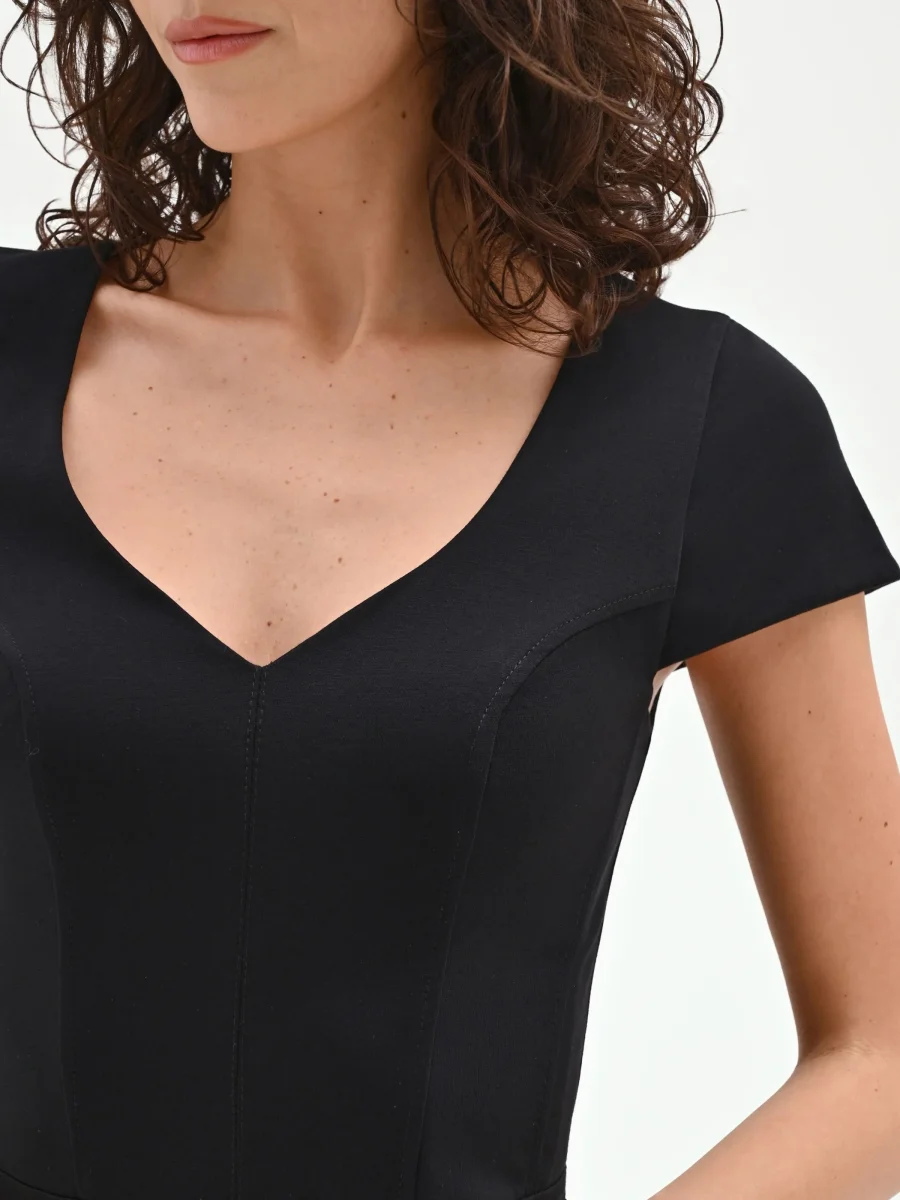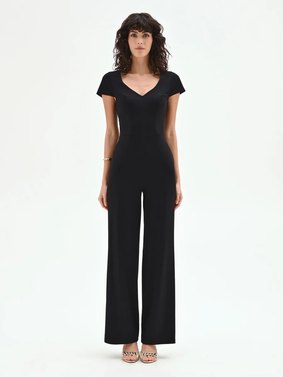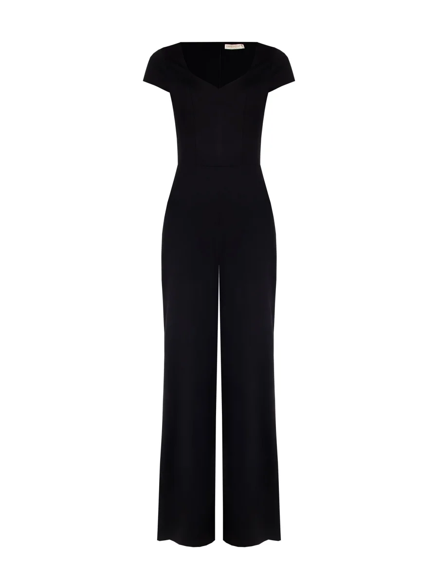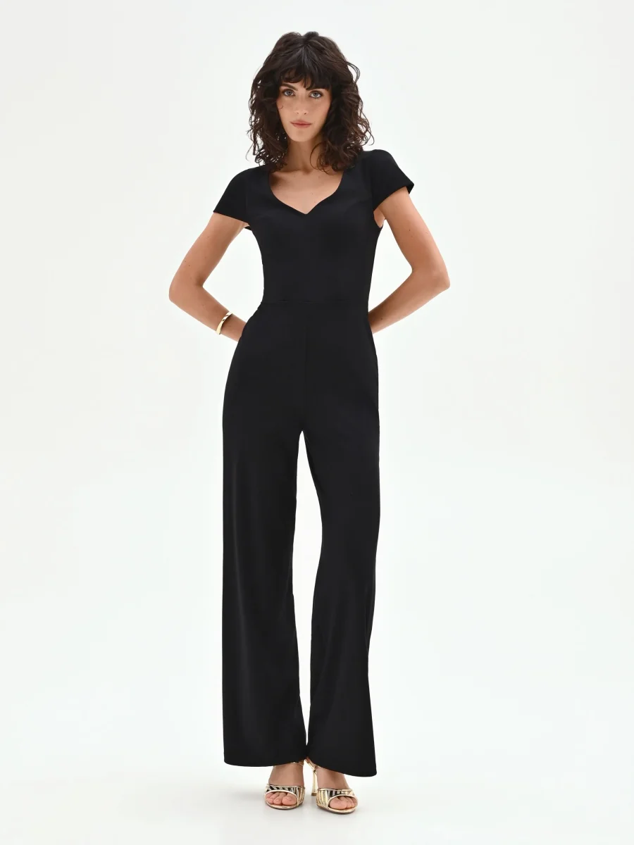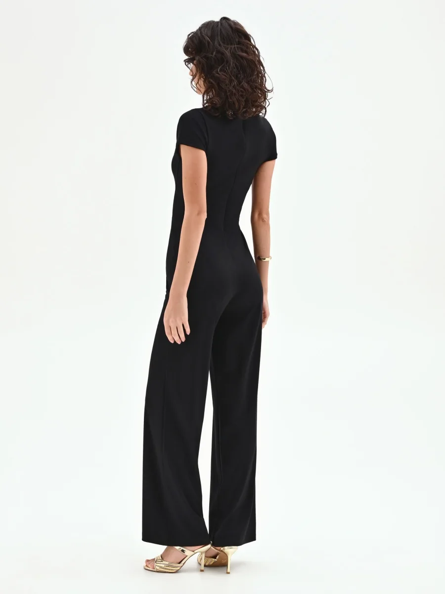 Un gioco di proporzioni e allure daily chic connotano la tuta nera, un capo dal design contemporaneo pensato per una femminilità decisa e moderna.