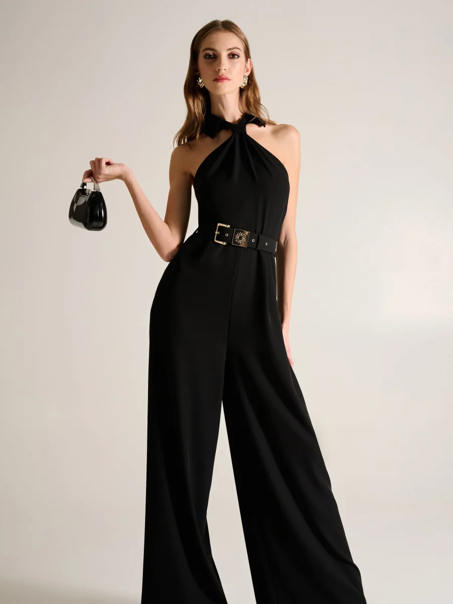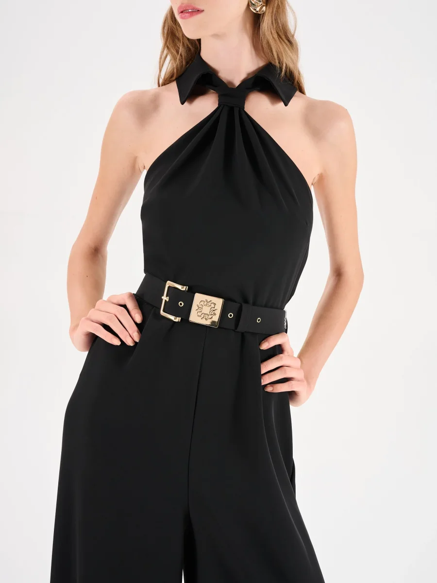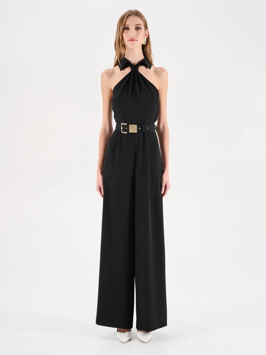 La tuta intera nera interpreta la femminilità con un carattere deciso e contemporaneo, unendo la fluidità dei volumi alla sensualità dei dettagli. Il capo si distingue per il corpino smanicato con scollo all’americana, un design che lascia le spalle scoperte con eleganza. L’allacciatura al collo si annoda morbidamente, creando un dettaglio ricercato che incornicia il décolleté. La linea della silhouette è definita in vita da una cintura regolabile, impreziosita da una fibbia rettangolare in metallo dorato dal design ornamentale. I pantaloni a gamba larga, dal taglio a palazzo, cadono dritti e fluidi, assicurando libertà di movimento e un fascino sofisticato.