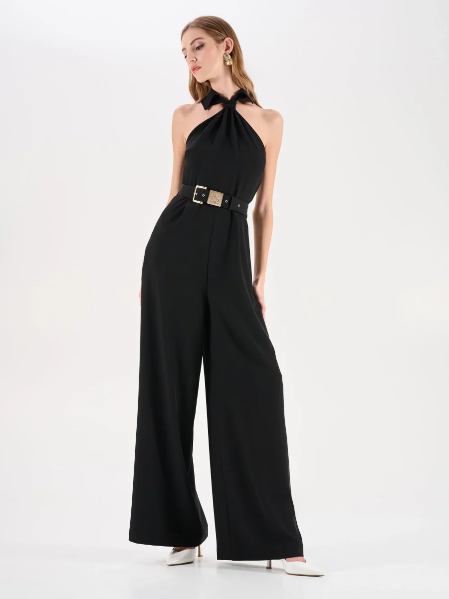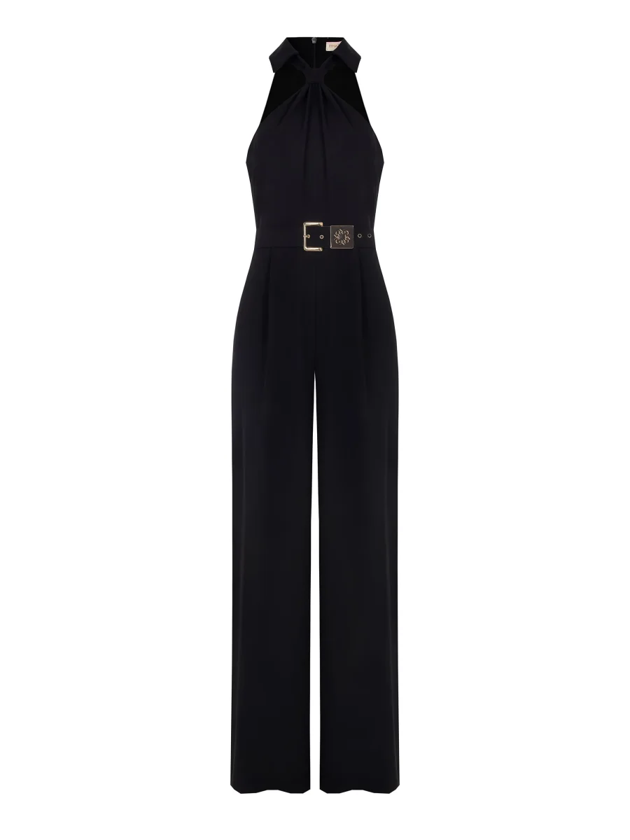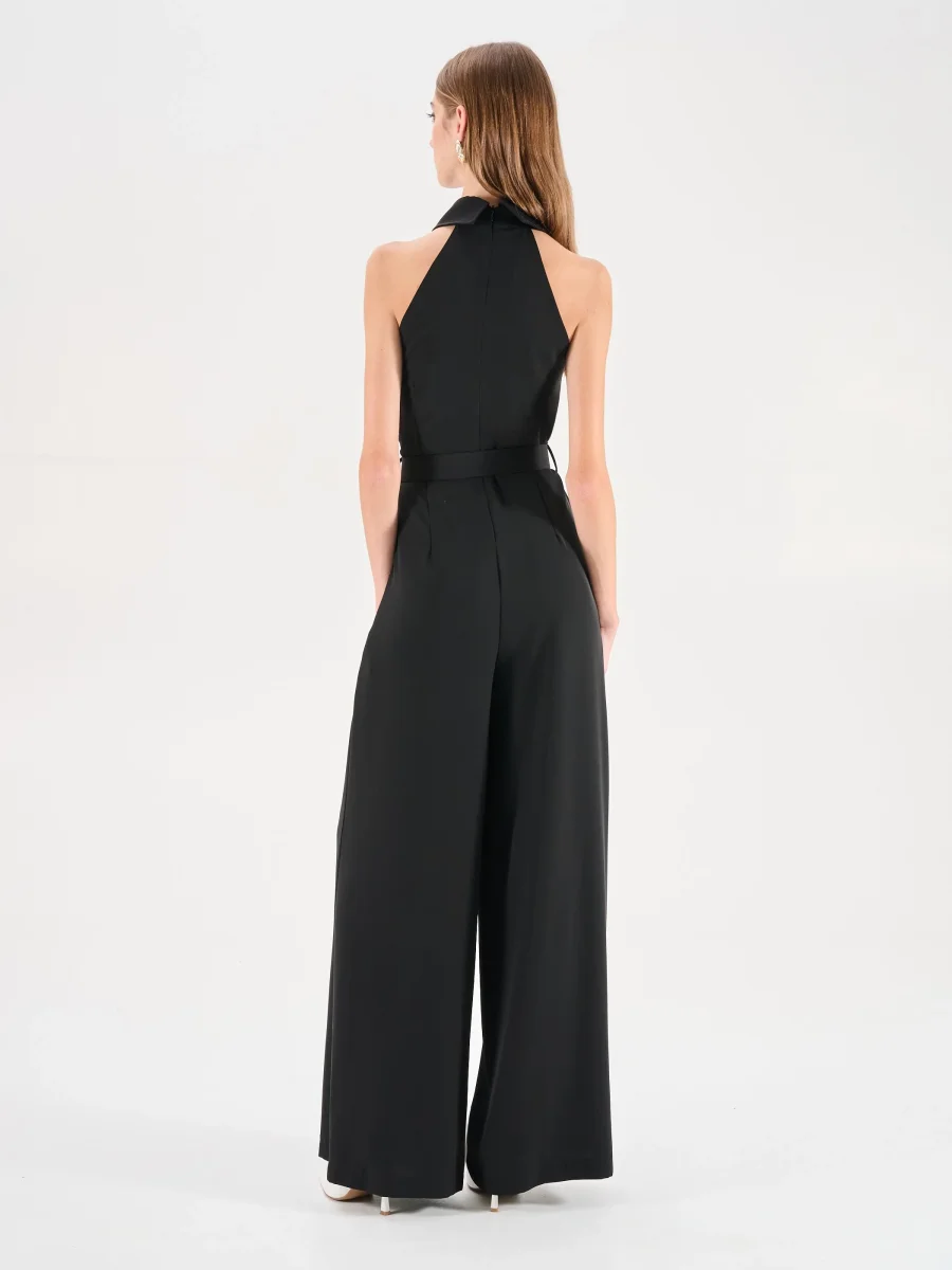 La tuta intera nera interpreta la femminilità con un carattere deciso e contemporaneo, unendo la fluidità dei volumi alla sensualità dei dettagli. Il capo si distingue per il corpino smanicato con scollo all’americana, un design che lascia le spalle scoperte con eleganza. L’allacciatura al collo si annoda morbidamente, creando un dettaglio ricercato che incornicia il décolleté. La linea della silhouette è definita in vita da una cintura regolabile, impreziosita da una fibbia rettangolare in metallo dorato dal design ornamentale. I pantaloni a gamba larga, dal taglio a palazzo, cadono dritti e fluidi, assicurando libertà di movimento e un fascino sofisticato.