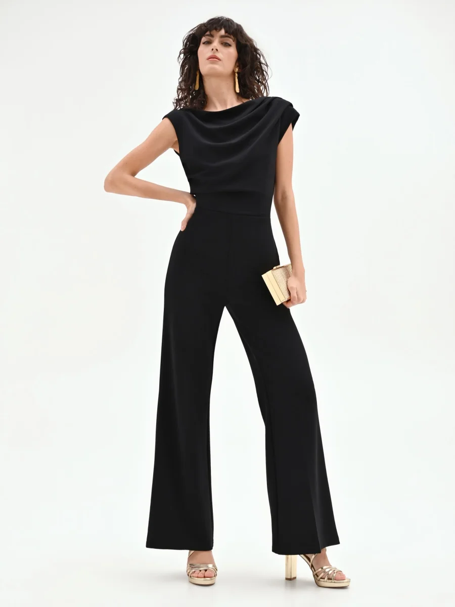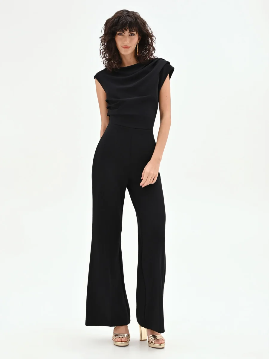 Un gioco di volumi e asimmetrie definisce la silhouette della tuta nera, un capo pensato per una donna contemporanea che ama stupire con eleganza. Realizzata in scuba crèpe, un tessuto tecnico che segue morbidamente le linee del corpo, questa tuta intera si distingue per il suo design unico e ricercato. Il corpetto cattura l’attenzione con un ampio scollo drappeggiato dal taglio asimmetrico, che lascia una spalla scoperta e avvolge l’altra in un sofisticato effetto cappuccio, conferendo al look un’allure quasi scultorea. Il punto vita alto, ben delineato, introduce l’ampiezza del pantalone a palazzo, la cui linea fluida e slanciata accompagna ogni movimento con grazia e leggerezza. La chiusura posteriore assicura una vestibilità perfetta e discreta, mantenendo pulita la linea del capo. Ideale per una cena elegante, un cocktail party o un evento speciale, la tuta si presta a molteplici interpretazioni: abbinala a un blazer per un’eleganza classica o a un chiodo per un contrasto audace e moderno. Una proposta di stile che esprime una femminilità decisa e non passerà inosservata.