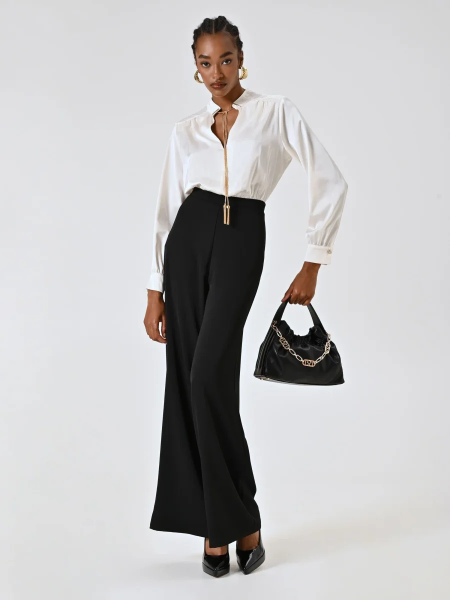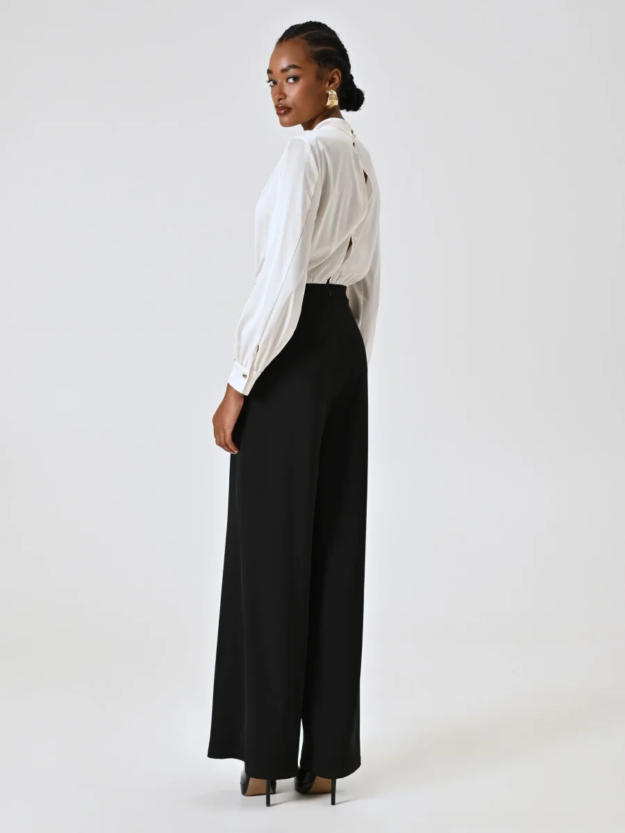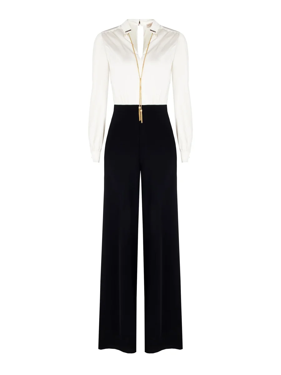 La Tuta Palazzo Bicolor è una proposta elegante e sofisticata, pensata per distinguersi nelle occasioni speciali. Realizzata con una blusa in raso fluido e pantaloni in cadi dalla linea ampia e morbida, la Tuta Palazzo Bicolor presenta maniche lunghe con polsino, un decoro gioiello removibile che illumina il décolleté e una chiusura posteriore con delicati bottoncini. La Tuta Palazzo Bicolor è ideale per eventi serali e cerimonie importanti: completala con calzature e accessori di collezione per un look impeccabile e, per una vestibilità perfetta, scegli la collezione Lingerie Rinascimento. La Tuta Palazzo Bicolor è Made in Italy. La modella è alta 1,77 m e indossa la taglia S.