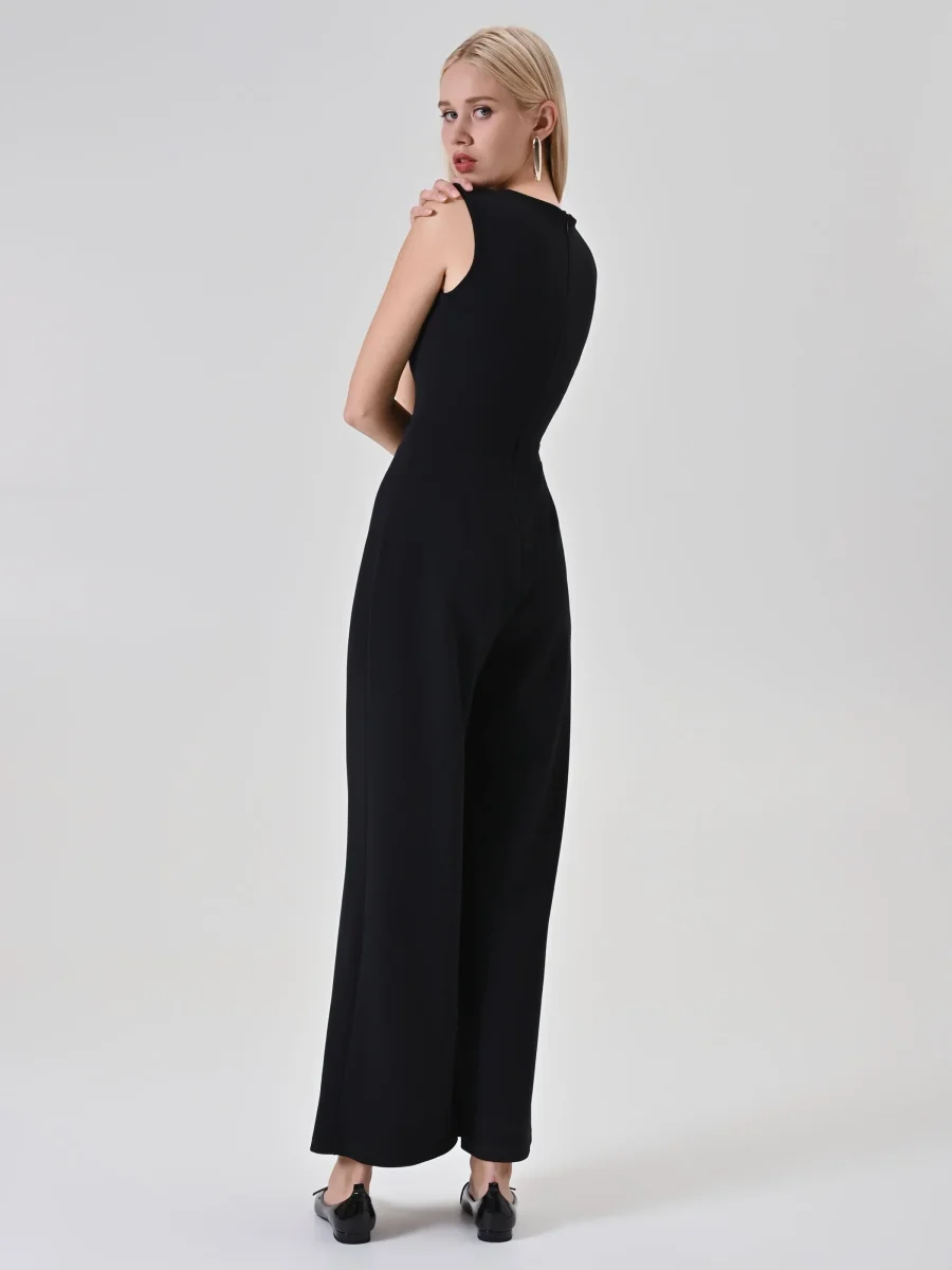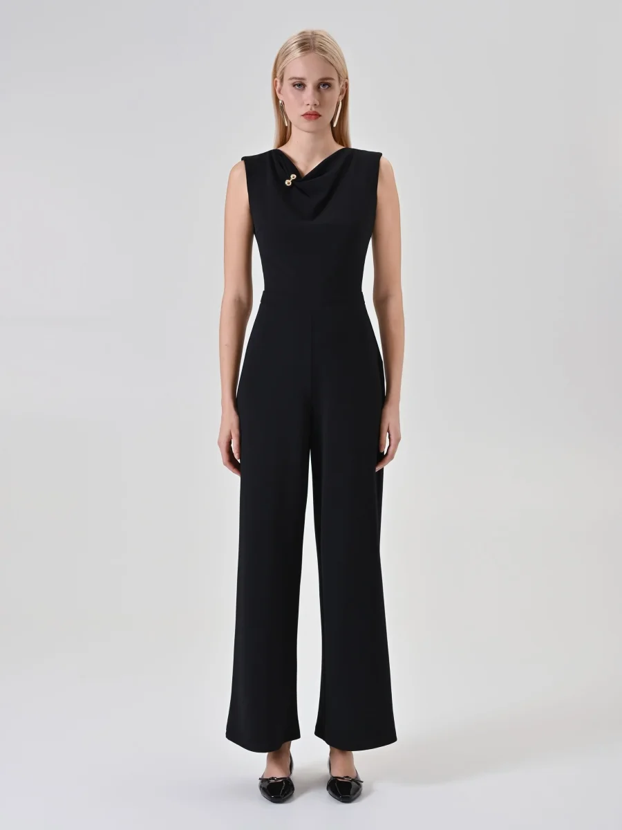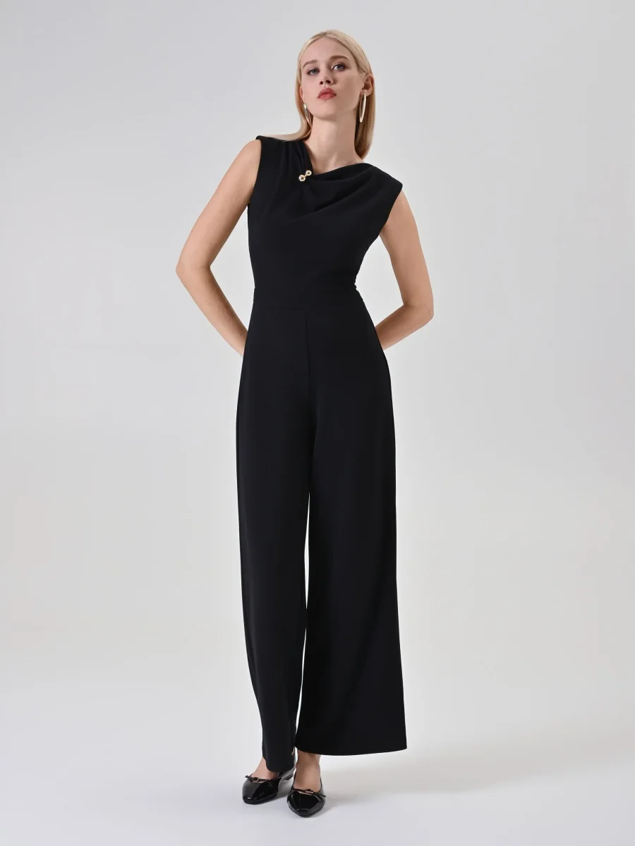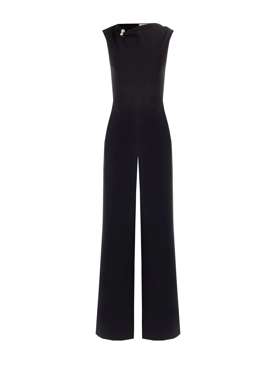 Realizzata in scuba mano crepe, un tessuto che scivola sulla silhouette, il design si distingue per il corpino smanicato con un morbido scollo drappeggiato, impreziosito sul fianco da un’applicazione gioiello color oro che illumina il total black. Il punto vita segnato introduce l’ampia linea del pantalone a palazzo, che slancia la figura con eleganza e fluidità in ogni movimento.