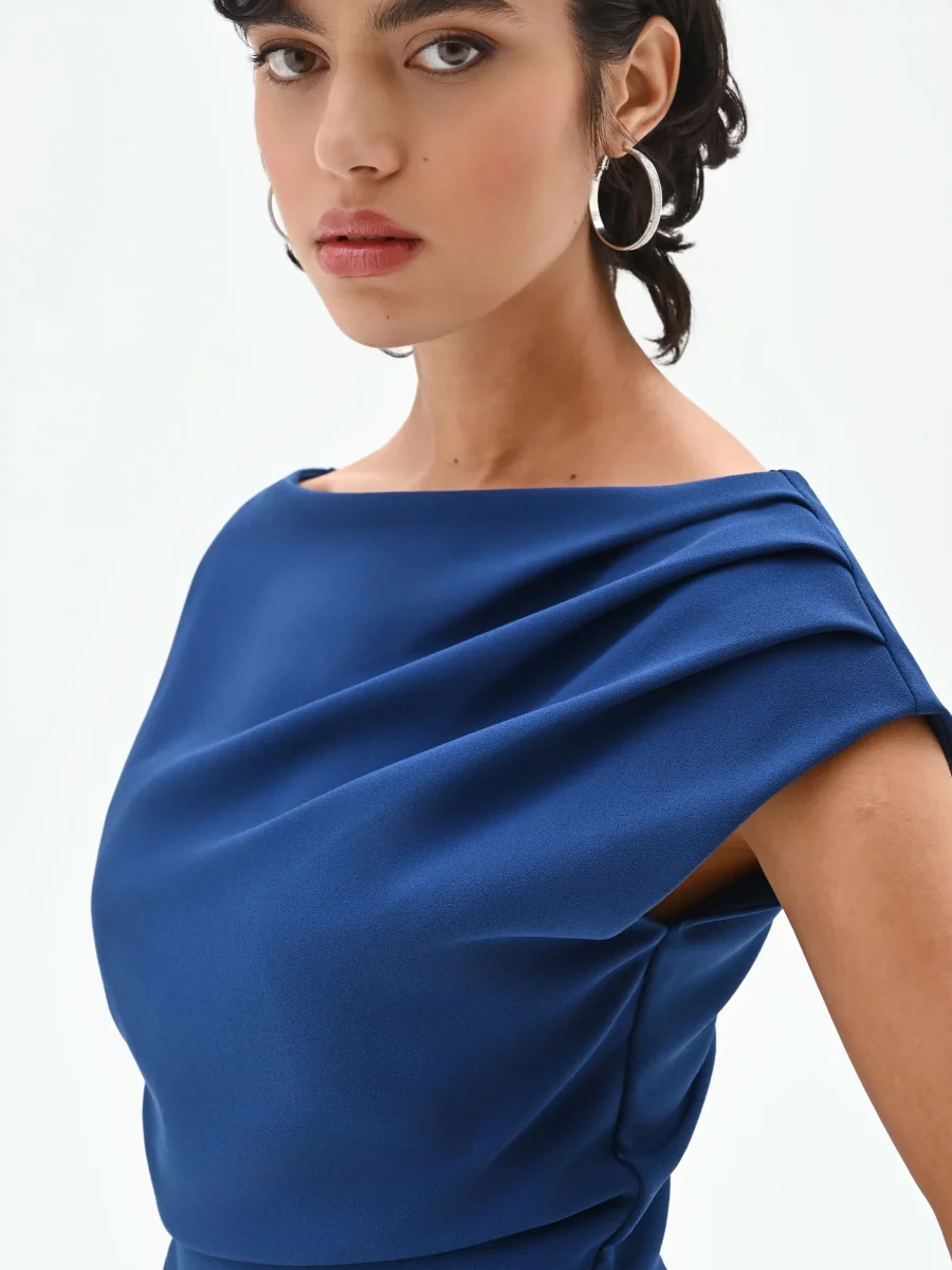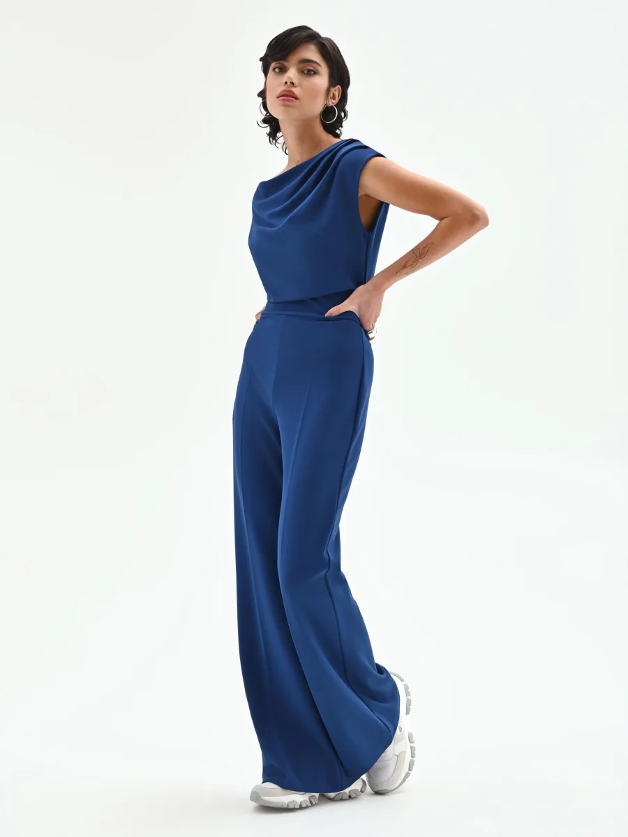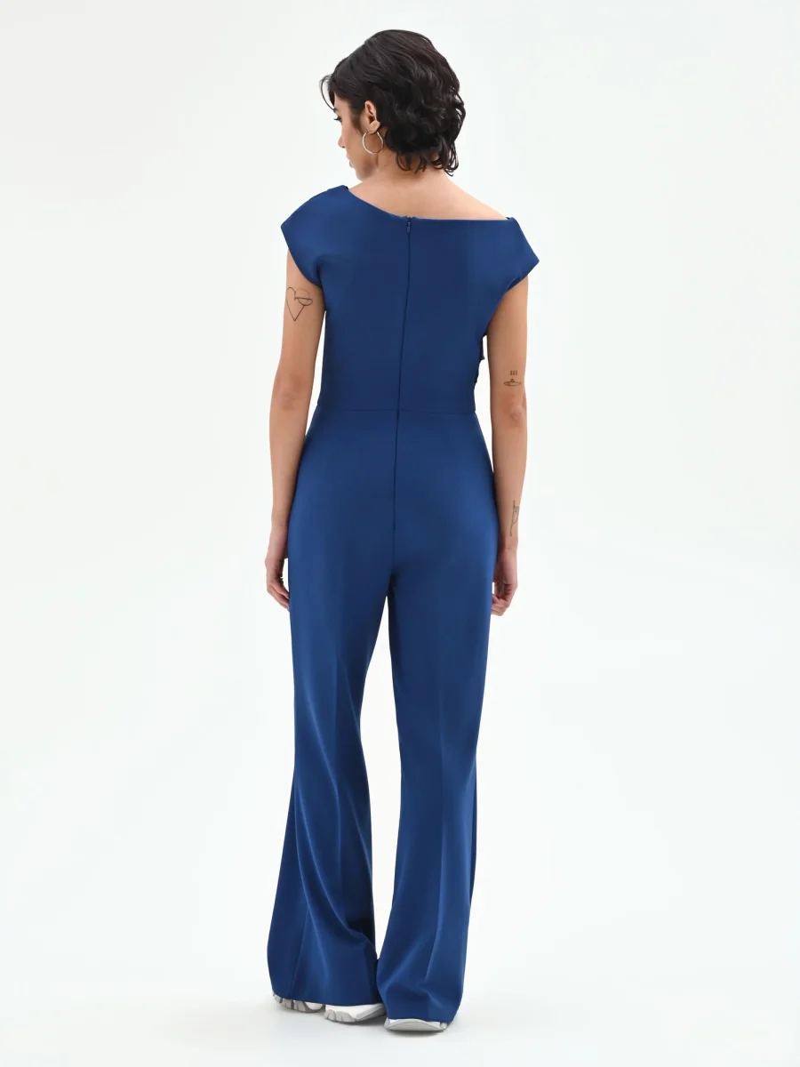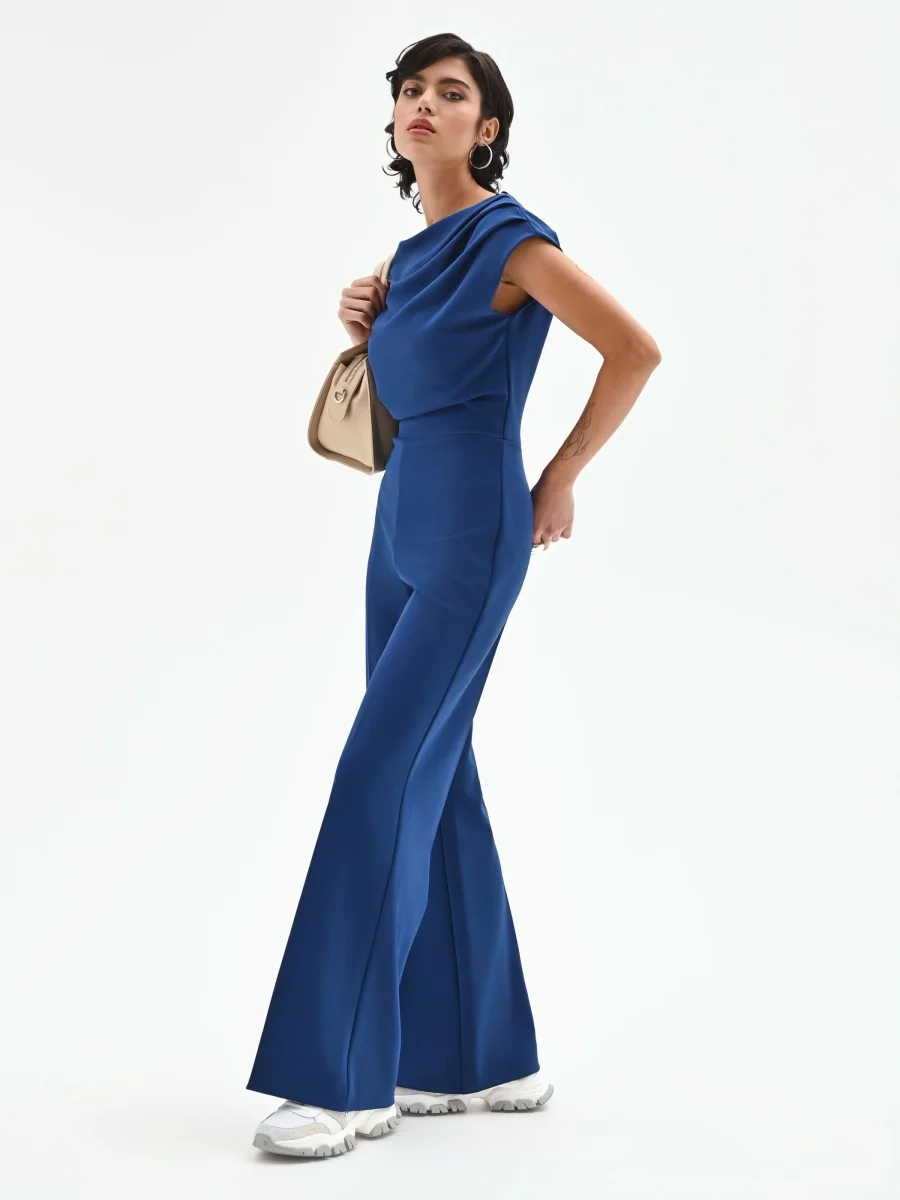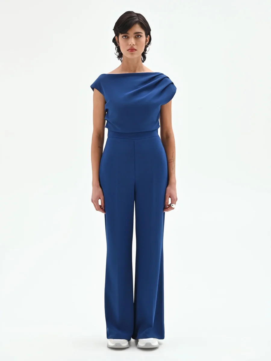 Una vibrazione cromatica intensa e magnetica caratterizza la tuta scollo asimmetrico scuba blu brillante, un capo che reinterpreta il concetto di eleganza contemporanea attraverso volumi studiati e texture moderne.