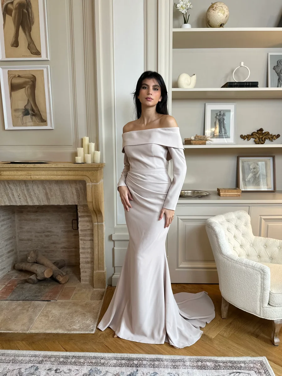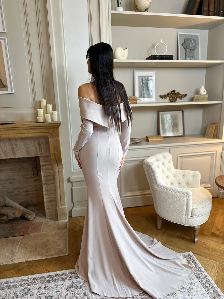 Parce qu’elle incarne l’élégance pure. Son col bateau sublime le port de tête, sa teinte beige apporte douceur et modernité, et sa coupe longue sans fente, associée à une traîne délicate, crée un mouvement fluide et majestueux. Une robe idéale pour celles qui recherchent une tenue distinguée, alliant simplicité, confort et glamour subtil.