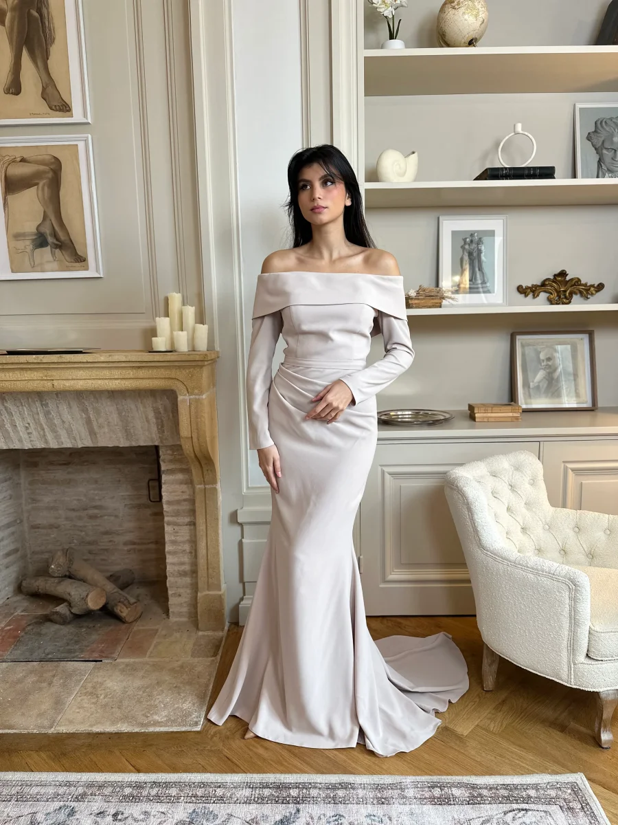 Cette élégante longue robe de soirée beige allie sobriété et sophistication avec harmonie. Ses manches longues ajoutent une note distinguée, tandis que son tissu fluide garantit un tombé impeccable. Sans fente, elle conserve une allure chic et intemporelle, parfaite pour les événements élégants. Chaque détail, du col bateau à la traîne légère, a été pensé pour créer un ensemble harmonieux et empreint de grâce.