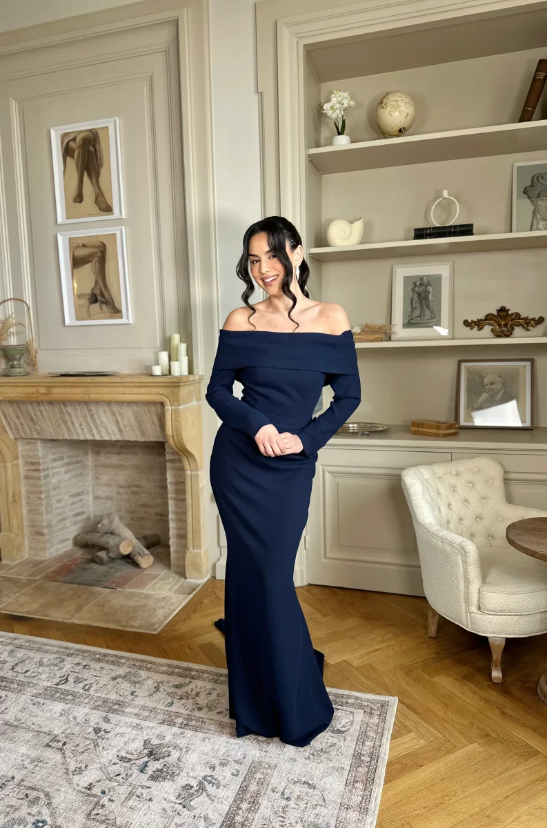 Pensée pour accompagner la mariée avec élégance, cette robe de soirée bleu marine pour demoiselle d’honneur allonge la silhouette grâce à sa coupe fluide et structurée. De plus, sa couleur bleu marine s’harmonise parfaitement avec des accessoires argentés, nacrés ou délicatement brillants. Enfin, son tissu doux et confortable assure un porté agréable tout au long de la cérémonie, sans compromis sur le style.