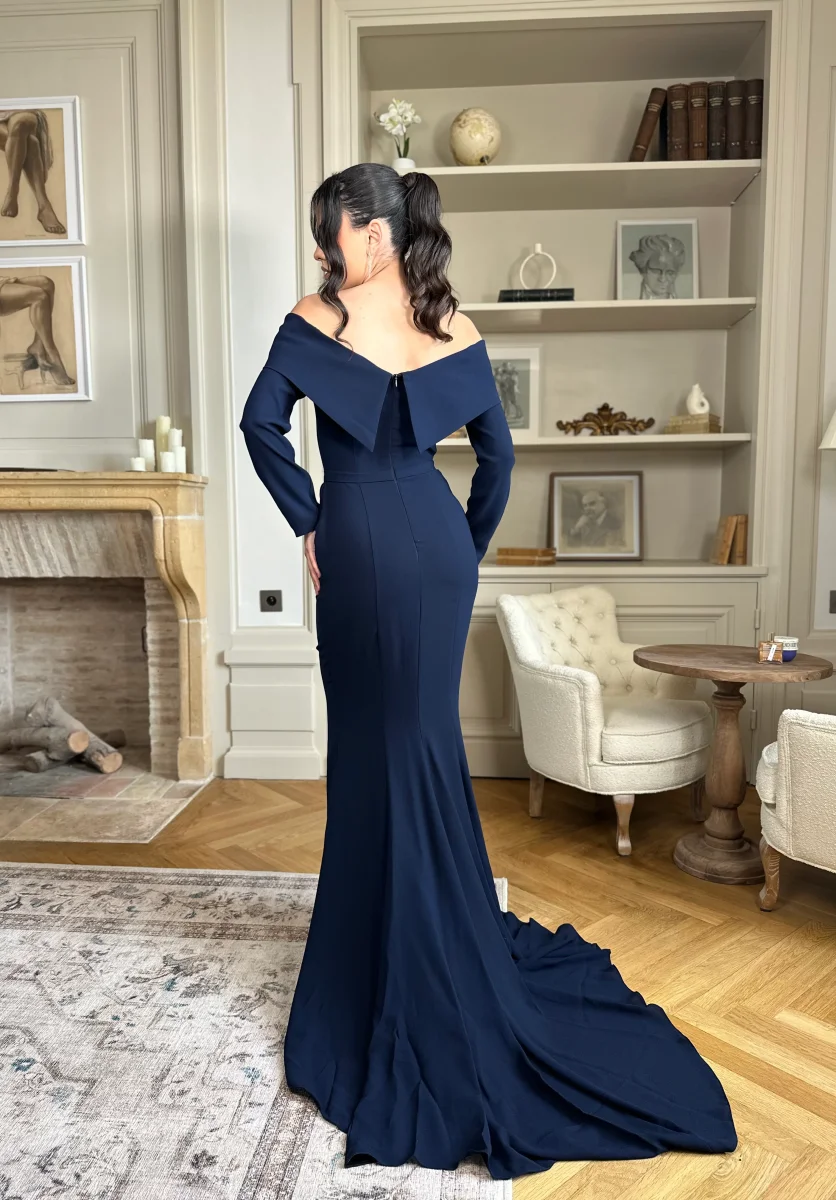 Cette robe de soirée bleu marine pour demoiselle d’honneur séduit par l’équilibre parfait entre simplicité et sophistication. En effet, ses manches longues ajoutent une note moderne et distinguée. L’absence de fente renforce son style classique et chic. Par ailleurs, la traîne légère apporte une dimension royale et gracieuse à chaque mouvement. Ainsi, cette robe se distingue par une élégance discrète et parfaitement maîtrisée.