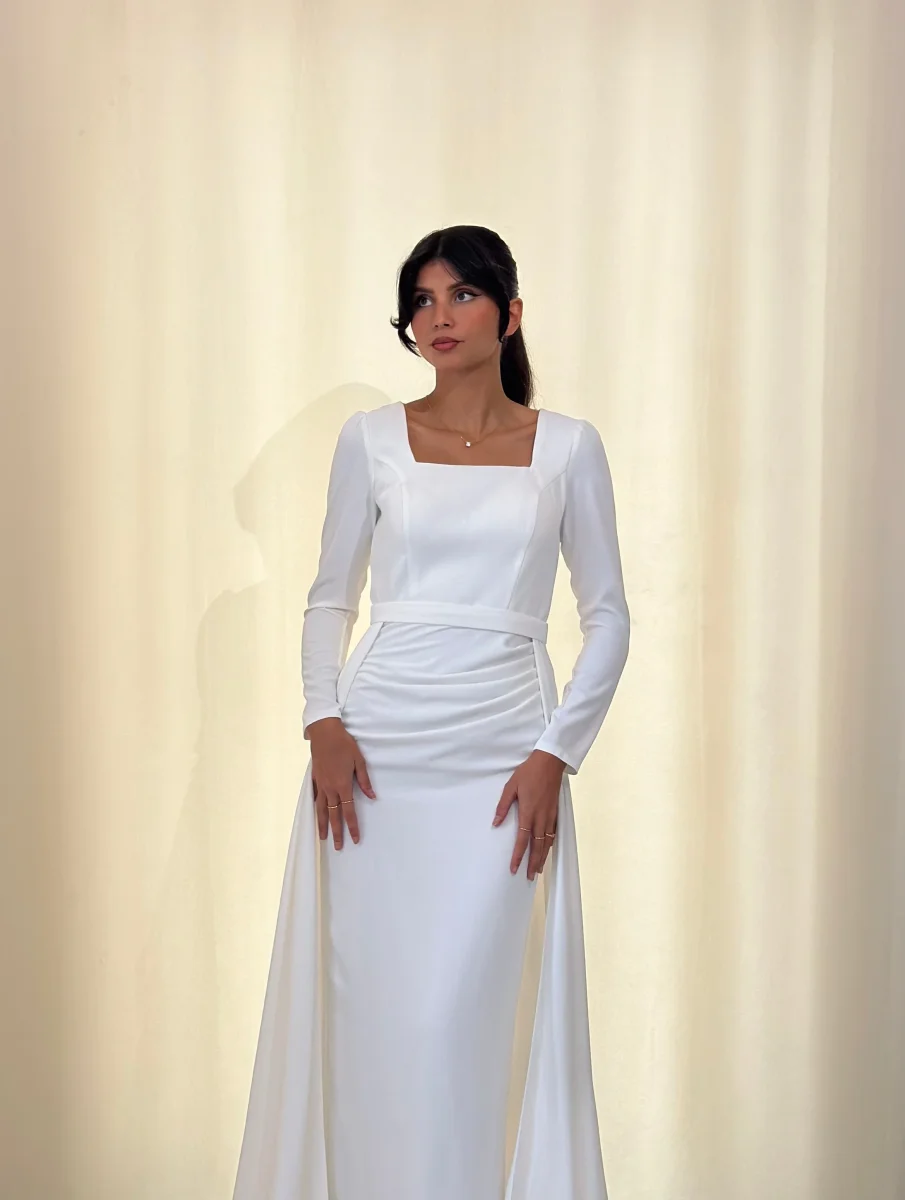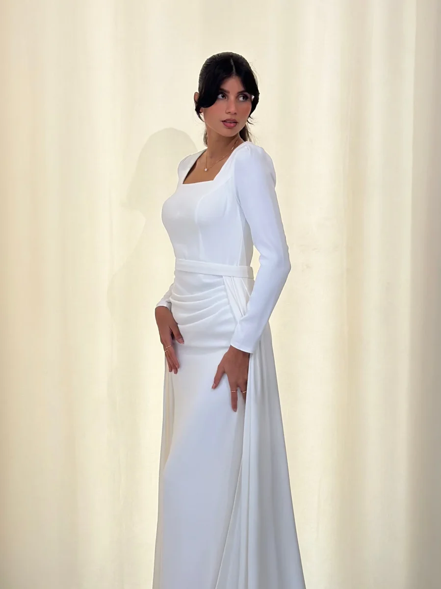 Longue robe blanc, sans fente. La mannequin mesure 1m67 et porte des talons de 7cm Attention à savoir, nos robes taillent petites, il faudra contrôler votre tour de taille avant toute commande.