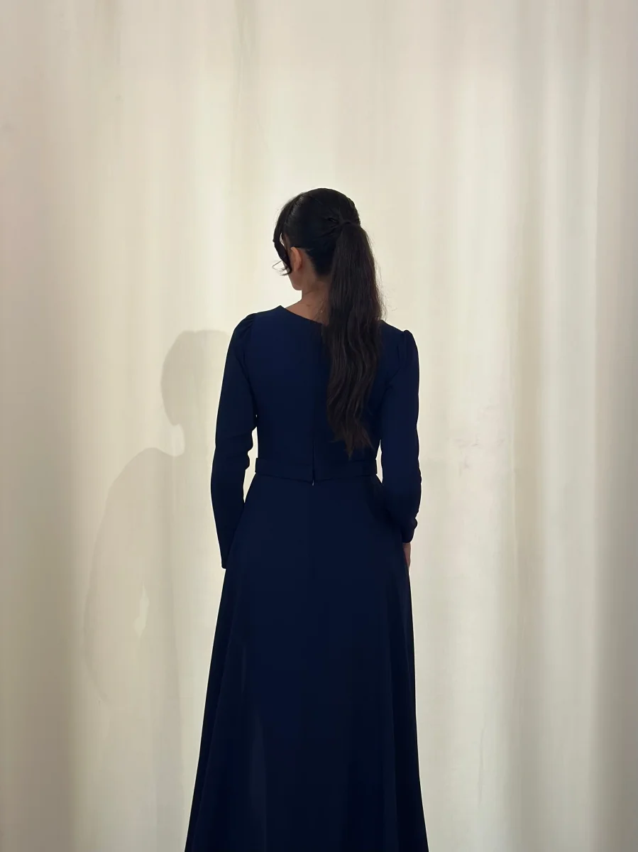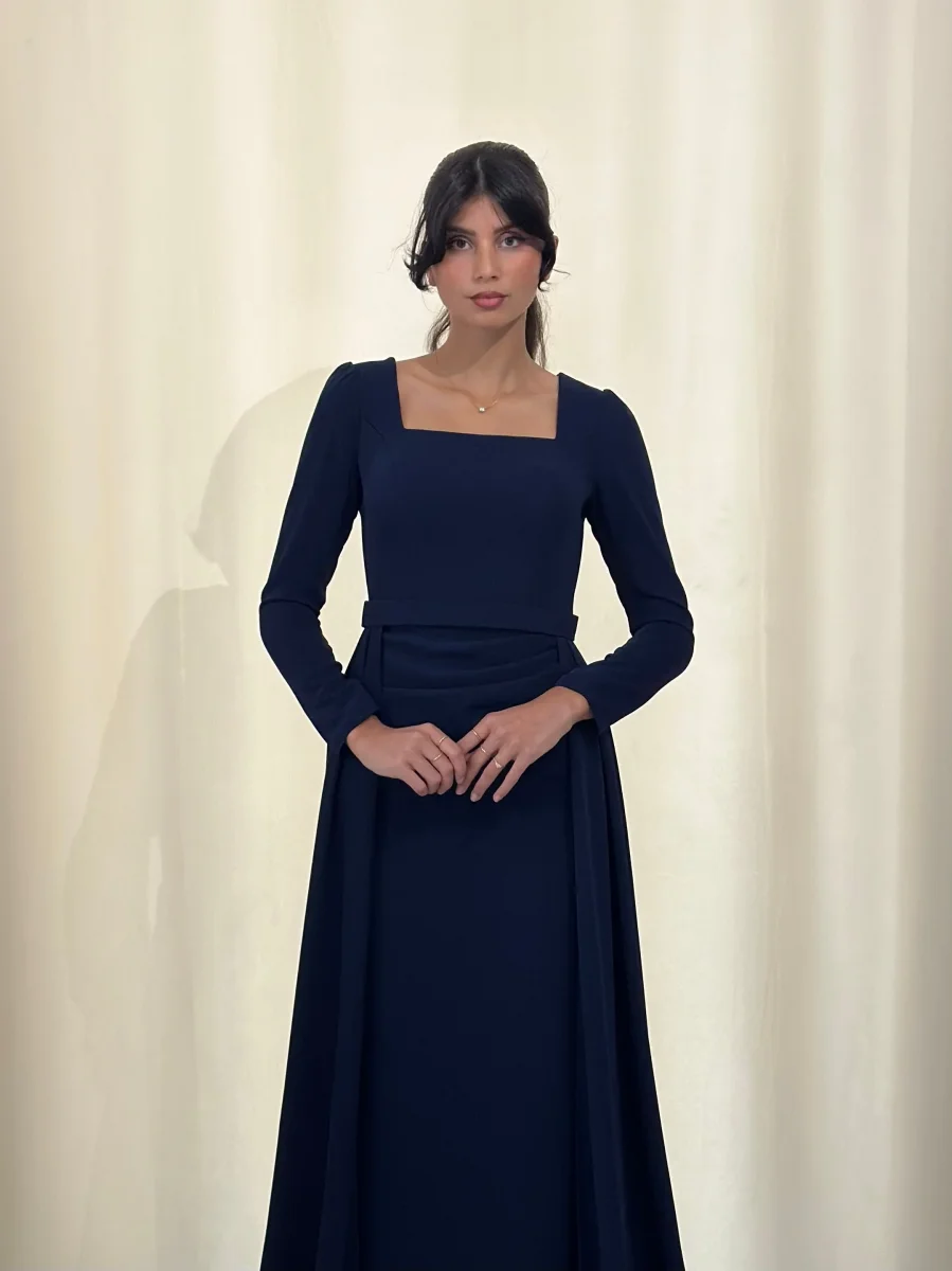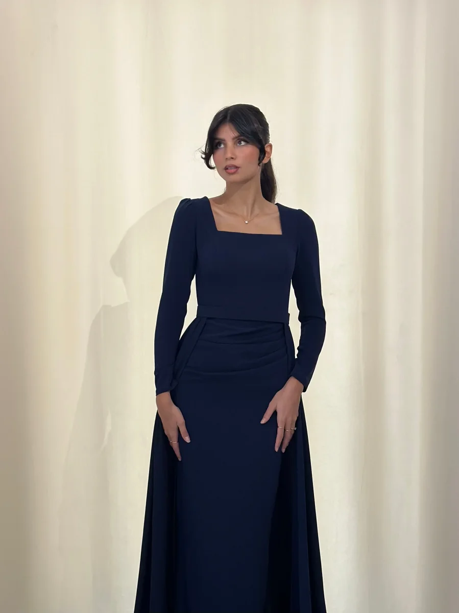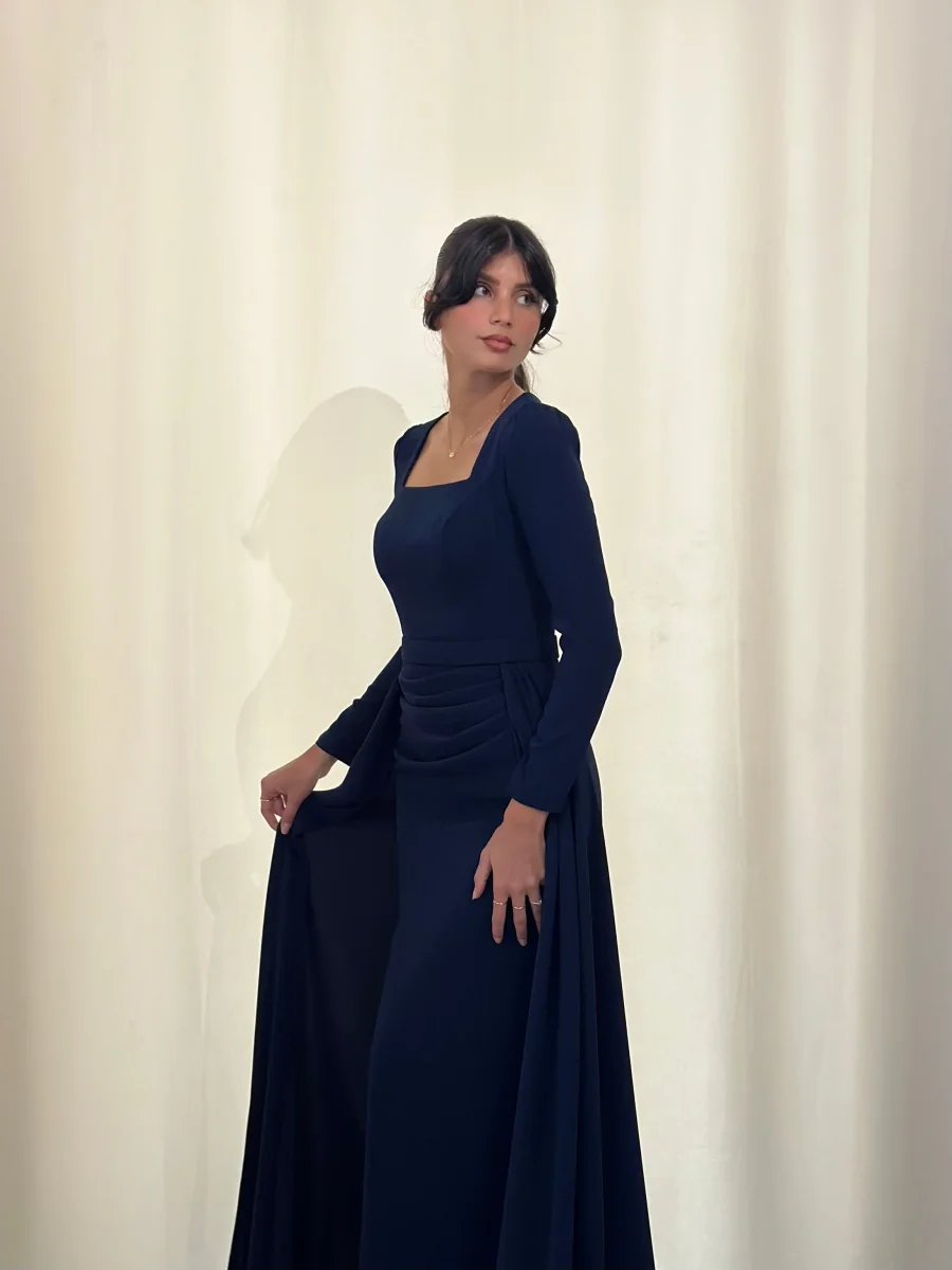Longue robe bleu marine, sans fente.