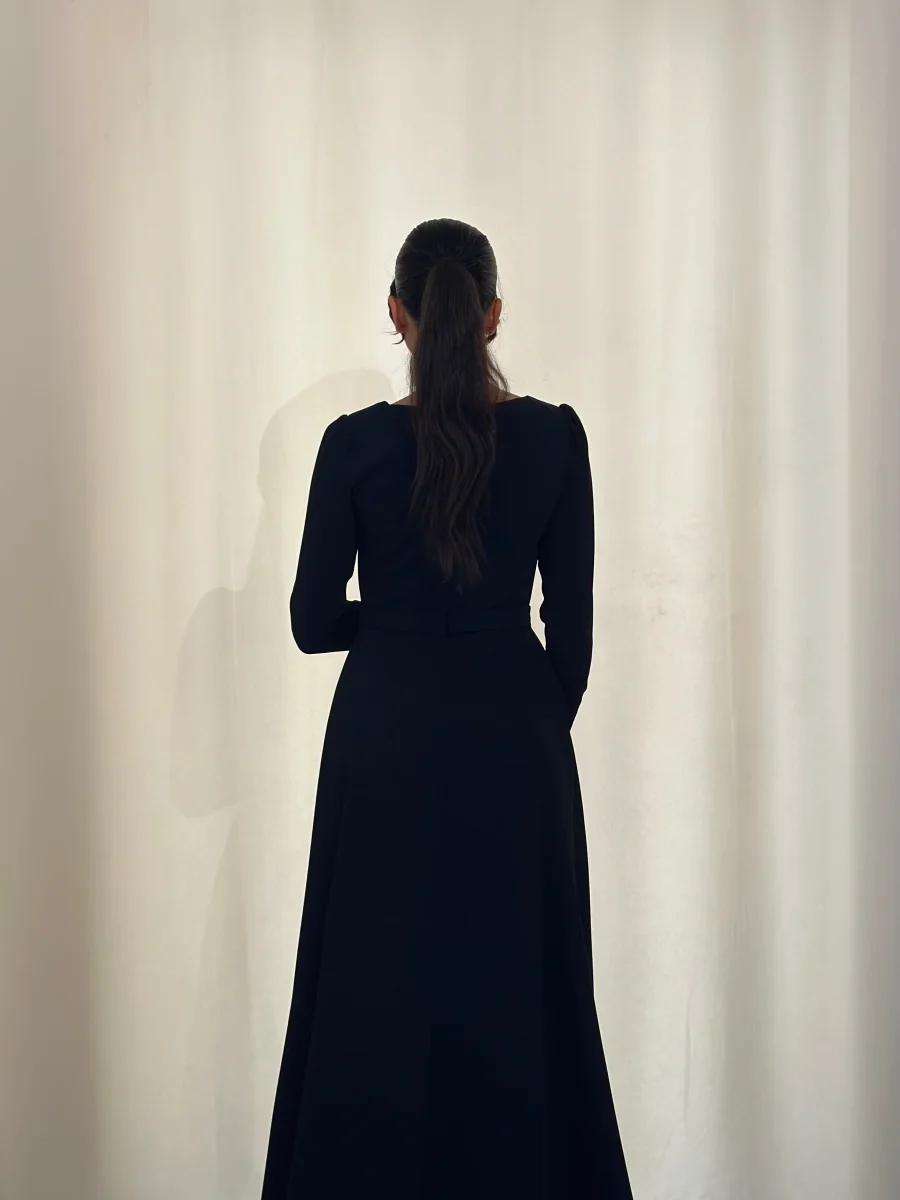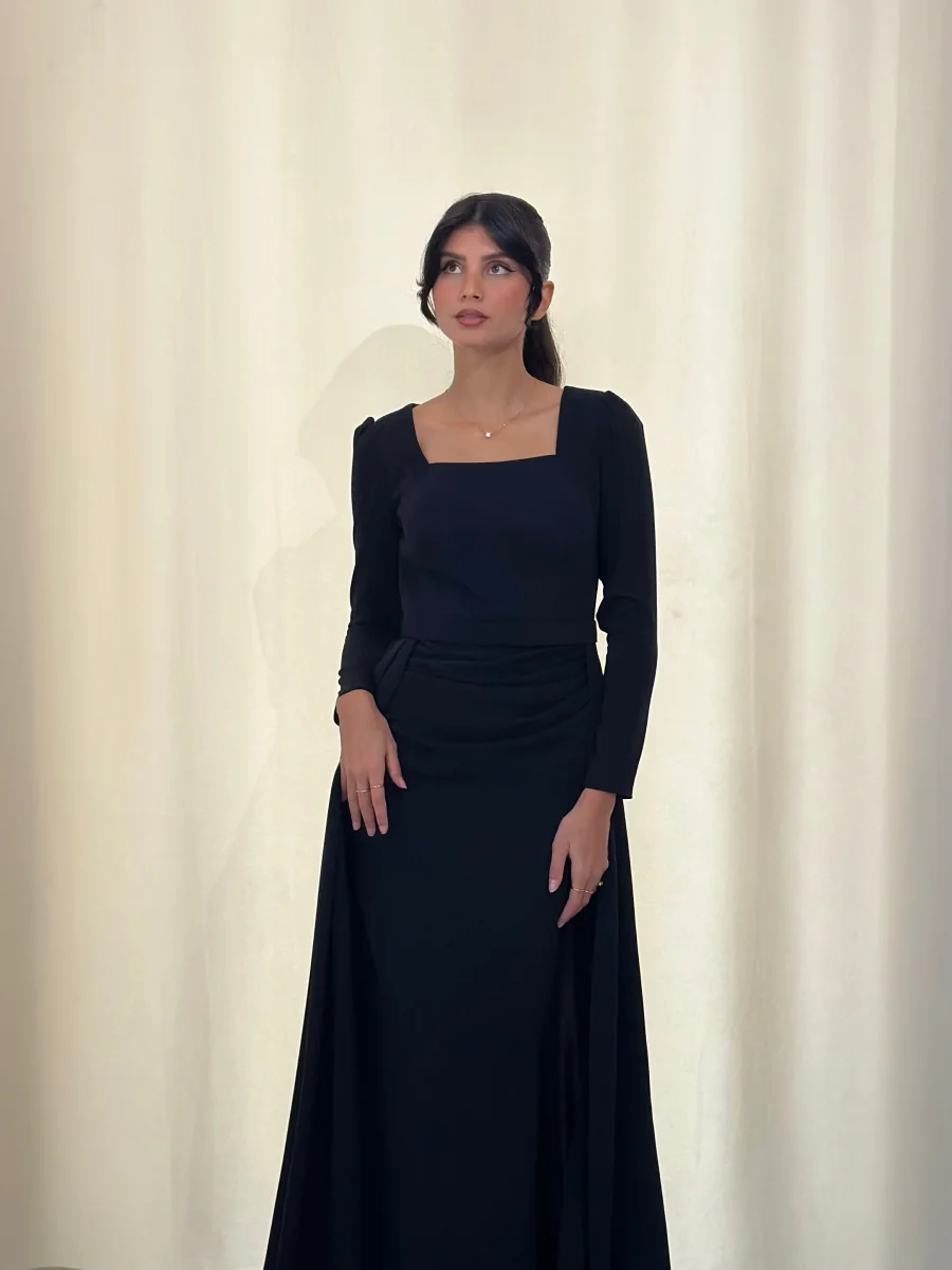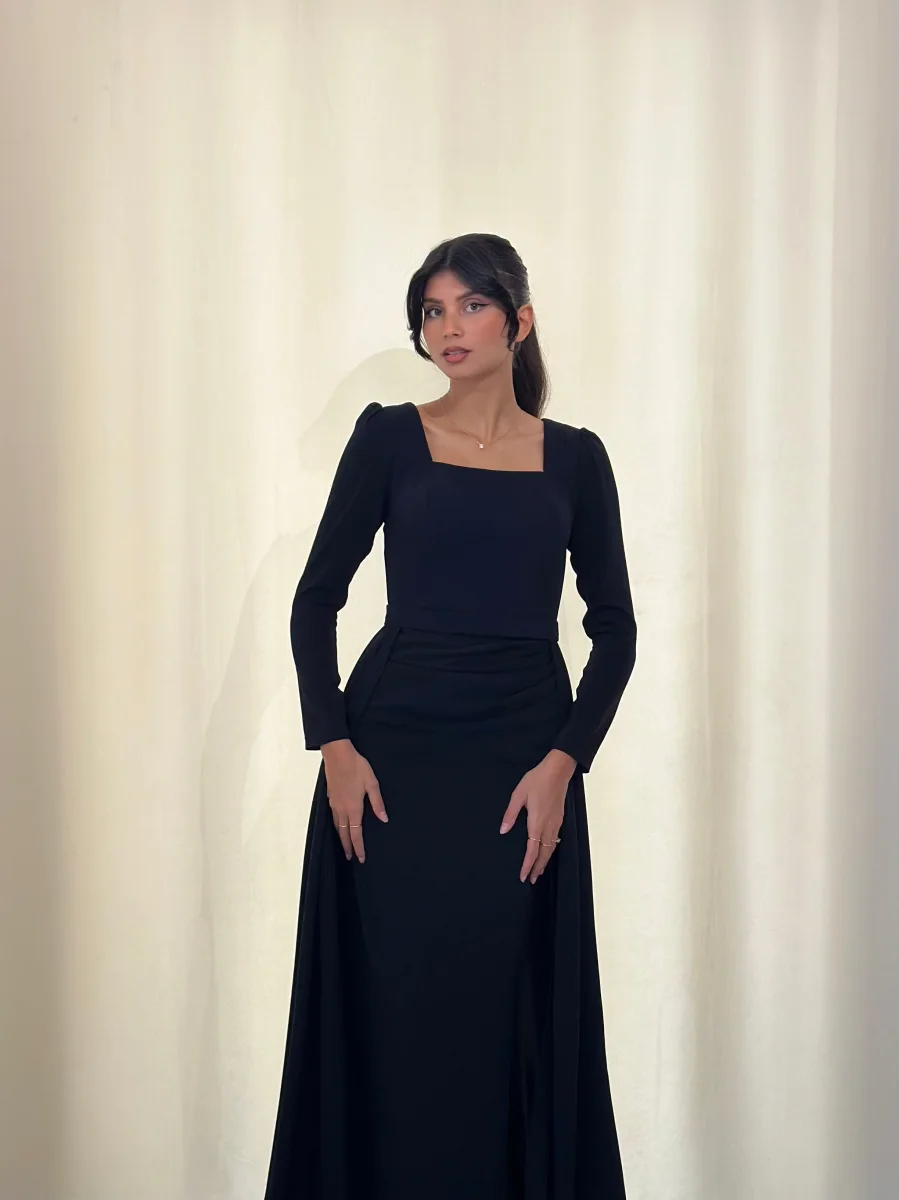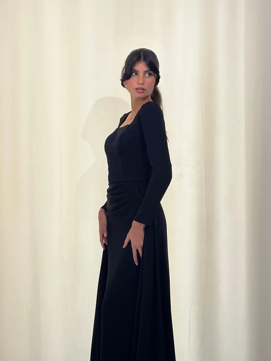 Longue robe noir, sans fente. La mannequin mesure 1m67 et porte des talons de 7cm Attention à savoir, nos robes taillent petites, il faudra contrôler votre tour de taille avant toute commande.